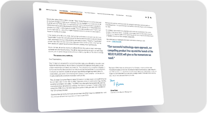 29 BMW Group Report 2024 To Our Stakeholders Combined Management Report Group Financial Statements Responsibility Statement and Auditor’s Report Remuneration Report Other Information Statement of the Chairman of the Board of Management We are also taking BMW’s original strength, “Sheer Driving Pleasure”, to a whole new level. At the Auto Shanghai in April, we will showcase the next highlight on our road to the NEUE KLASSE with the “BMW Vision Driving Experience”. With its strong emotional appeal, the VDX is the most powerful development prototype BMW has ever built. It showcases in im- pressive style what is technologically feasible. This is made possible by our “Heart of Joy” for driving dynamics – one of four highly integrated electronic control units developed in- house for the NEUE KLASSE. In the models of the NEUE KLASSE, the four high-performance computers we refer to as “superbrains” cluster the computing power for key customer functionality around infotain- ment, automated driving, driving dynamics and basic functions. These four “superbrains” provide more than 20 times the computing power of the current systems, ensuring long- term security for upcoming software and function updates, including AI features. As you can see, all our future products will benefit from the quantum leap in technology achieved with the NEUE KLASSE. This will be made possible by relying on our technology clusters, which can be integrated into all future vehicles, regardless of the drive technology. The success story continues. Dear Shareholders, Your Company is renowned for outstanding technologies, groundbreaking innovations and highly emotional products. We promise our customers the signature driving pleasure and unique experiences our brands are known for. That is both our mission and our obligation. It is how we drive the development of our industry and set the benchmark for our competitors. It secures our business model. We are growing profitably and gaining market share. As shareholders, you benefit from the long-term success of your Company – and we are con- tinually creating the conditions necessary to ensure this. The US-based Consumer Reports tested 32 brands in its latest report, ranking BMW first for luxury brands and second industry-wide. Evaluation criteria included road testing, reliability, customer satisfaction and safety. The BMW Group also performed exceptionally well in re- nowned employer attractiveness rankings. For instance, Germany’s Trendence Barometer named the BMW Group the best employer for professionals, graduates and specialists for the 13th consecutive year. Opportunities can be found in every environment: the BMW Group truly believes this – and this mindset will continue to guide us in financial year 2025. We have set ourselves ambitious goals. Our successful technology-open approach, our compelling product line-up and the launch of the NEUE KLASSE will give us the momentum we need. Our strategy is grounded in facts, experience and continuous assessment of the current situation. It has proven robust – especially in challenging conditions. We remain on course to achieve our long-term goals. At the same time, we are able to respond with a high degree of flexibility if our environment changes unexpectedly. We understand our challenges and remain committed to charting our own course – ↗ MORE THAN EVER. The heart of BMW beats around the globe. Your Company is made up of more than 159,000 employees at more than 30 production locations and across our sales network in over 140 countries. It is important to our entire team that you, our shareholders, continue to support us and stand behind our long-term strategic direction. On behalf of all our employ- ees, I would like to sincerely thank you for this. Oliver Zipse Chairman of the Board of Management ‘‘Our successful technology-open approach, our compelling product line-up and the launch of the NEUE KLASSE will give us the momentum we need.’’
