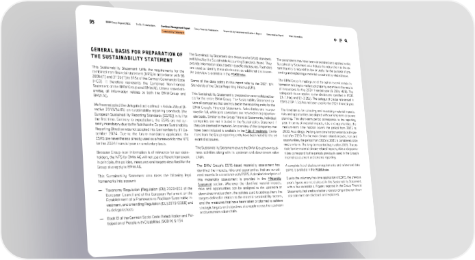 95 BMW Group Report 2024 To Our Stakeholders Combined Management Report Group Financial Statements Responsibility Statement and Auditor’s Report Remuneration Report Other Information Sustainability Statement GENERAL BASIS FOR PREPARATION OF THE SUSTAINABILITY STATEMENT This Sustainability Statement fulfils the requirements for the combined non-financial statement (NFS) in accordance with §§ 289b (1) and 315b (1) to 315c of the German Commercial Code (HGB). It therefore represents the Combined Non-financial Statement of the BMW Group and BMW AG. Unless stated oth- erwise, all information relates to both the BMW Group and BMW AG. We have adopted the delegated act outlined in Article 29b of Di- rective 2013/34/EU on sustainability reporting standards (the European Sustainability Reporting Standards [ESRS]) in full for the first time. Contrary to expectations, the ESRS are not cur- rently mandatory due to the fact that the Corporate Sustainability Reporting Directive was not adopted into German law by 31 De- cember 2024. Due to the future mandatory application, the ESRS are nevertheless already used as a framework for the NFE for the 2024 financial year on a voluntary basis. Because Group-level information is of relevance for our stake- holders, the NFS for BMW AG will not use a different framework. In principle, the policies, measures and targets described for the Group also apply to BMW AG. This Sustainability Statement also takes the following legal frameworks into account: — Taxonomy Regulation (Regulation (EU) 2020 /852 of the European Council and of the European Parliament on the Establishment of a Framework to Facilitate Sustainable In- vestment, and amending Regulation (EU) 2019 /2088) and its delegated acts — Book IX of the German Social Code: Rehabilitation and Par- ticipation of People with Disabilities (SGB IX) § 154 The Sustainability Statement also draws on the SASB standards published by the Sustainable Accounting Standards Board. They provide information about sector-specific disclosures. Footnotes are used to identify these disclosures as additional disclosures. An overview is available in the ↗ SASB Index. Some of the data points in this report refer to the 2021 GRI Standards of the Global Reporting Initiative (GRI). This Sustainability Statement is prepared on a consolidated ba- sis for the entire BMW Group. The Sustainability Statement co- vers all companies that are included in the reporting entity for the BMW Group’s Financial Statements. Subsidiaries are incorpo- rated in full, while joint operations are included on a proportion- ate basis. Similar to the Group Financial Statements, individual companies are not included in the Sustainability Statement if they are deemed immaterial. An overview of the companies that have been included is available in the ↗ List of Investments. Devia- tions from the Group reporting entity have been noted for the rel- evant disclosures. The Sustainability Statement covers the BMW Group’s own busi- ness activities along with its upstream and downstream value chain. The BMW Group’s ESRS-based materiality assessment has identified the impacts, risks and opportunities that are consid- ered material in accordance with ESRS. A detailed description of this materiality assessment is provided in the ↗ Materiality Assessment section. Whenever the identified material impacts, risks and opportunities can be assigned to the upstream or downstream value chain, the policies used to address them, the targets defined in relation to the material sustainability matters, and the measures that have been taken or planned to achieve strategic targets and objectives also apply across the upstream or downstream value chain. The parameters that have been determined and applied in this Sustainability Statement also include the value chain to the ex- tent that this is required by law or useful for the purpose of pre- senting and explaining a material sustainability-related issue. The BMW Group is making use of the option to omit certain in- formation relating to intellectual property, expertise or the results of innovations for the 2024 financial year (§ 289e HGB). The safeguard clause applies to the disclosures specified in ESRS E1-1.16c) and E1-3.29c). The safeguard clause referenced in ESRS 2 BP-1.5e) has not been used for the 2024 financial year. The timeframes for collecting and assessing material impacts, risks and opportunities are aligned with our long-term corporate planning. The short-term period corresponds to the reporting year. In terms of material impacts, risks and opportunities, the medium-term time horizon covers the period from 2025 to 2030. Accordingly, the long-term time horizon extends to the pe- riod after 2030. For the main climate-related impacts, risks and opportunities, the period from 2025 to 2035 is considered to be medium-term. The long-term period begins after 2035. The pe- riods for the material climate-related impacts, risks and opportu- nities correspond to the periods previously used in the Group’s internal assessment and external reporting. A complete list of disclosure requirements and referenced data points is available in the ↗ ESRS Index. Due to the voluntary first-time application of ESRS, the previous year’s figures are not disclosed in this Sustainability Statement, with a few exceptions. Figures reported in the Group Financial Statements that enable a better understanding of the non-finan- cial statement are disclosed and explained.