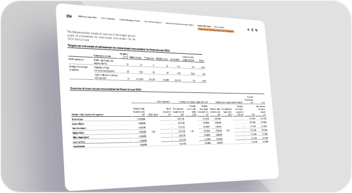 394 BMW Group Report 2024 To Our Stakeholders Combined Management Report Group Financial Statements Responsibility Statement and Auditor’s Report Remuneration Report Other Information II. Remuneration of the Members of the Board of Management The following tables provide an overview of the targets set and extent of achievement for share-based remuneration for the 2024 financial year. Targets set and extent of achievement for share-based remuneration for financial year 2024 Performance criteria Weighting (in %) Minimum value Target value Maximum value Actual value Extent to which target achieved Factor RoCE component RoCE in the Automotive segment (in %) 50 12 17 22 11.4 0% 0.00 Strategic focus target component Reduction of fleet CO2 emissions (in g/km) 25 125 101 97 99.5 130% 1.30 Sales of all-electric vehicles (BEV) in units 25 460,000 547,000 630,000 426,536 0% 0.00 Overview of share-based remuneration for financial year 2024 RoCE component Strategic focus target component (CO2) Strategic focus target component (BEV) Strategic focus targets total Total Member of the Board of Management Proportionate target amount in € RoCE factor RoCE component in € Proportionate target amount in € Strategic focus target factor (CO2) Strategic focus target component CO2 in € Proportionate target amount in € Strategic focus target factor (BEV) Strategic focus target component BEV in € in € Personal cash investment amount in € Oliver Zipse 1,175,000 0.00 – 587,500 1.30 763,750 587,500 0.00 – 763,750 763,750 Jochen Goller 550,000 – 275,000 357,500 275,000 – 357,500 357,500 Ilka Horstmeier 640,000 – 320,000 416,000 320,000 – 416,000 416,000 Walter Mertl 550,000 – 275,000 357,500 275,000 – 357,500 357,500 Milan Nedeljković 640,000 – 320,000 416,000 320,000 – 416,000 416,000 Joachim Post 550,000 – 275,000 357,500 275,000 – 357,500 357,500 Frank Weber 640,000 – 320,000 416,000 320,000 – 416,000 416,000