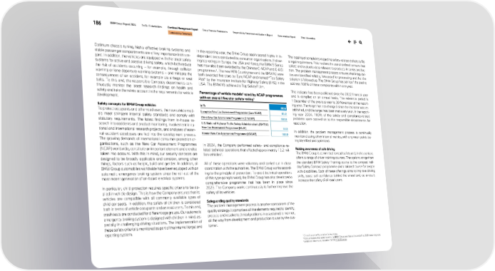 186 BMW Group Report 2024 To Our Stakeholders Combined Management Report Group Financial Statements Responsibility Statement and Auditor’s Report Remuneration Report Other Information Sustainability Statement Optimum chassis tuning, highly effective braking systems and stable passenger compartments are of key importance in this re- gard. In addition, the vehicles are equipped with the latest safety systems for active and passive driving safety, which both reduce the risk of accidents occurring – for example, through collision warning or lane departure warning systems – and mitigate the consequences of an accident, for example via airbags or seat belts. To this end, the responsible Company departments con- tinuously monitor the latest research findings on health and safety and take them into account in the requirements for vehicle development. Safety concepts for BMW Group vehicles To protect occupants and other road users, the new vehicle mod- els meet stringent internal safety standards and comply with statutory requirements. The latest findings from in-house re- search into accidents and product monitoring, involvement in na- tional and international research projects, and analyses of exter- nal accident databases are fed into the development process. The growing demands of international consumer protection or- ganisations, such as the New Car Assessment Programmes (NCAP) worldwide, constitute an important element and are also taken into account. With this in mind, our security concepts are designed to be broadly applicable and consider, among other things, factors such as height, build and gender. In addition, all BMW Group automobiles worldwide have been equipped with an automatic emergency braking system since the roll-out of the most recent generation of on-board electrical systems. In particular, child protection requires specific criteria to be ap- plied in vehicle design. This is how the Company ensures that its vehicles are compatible with all commonly available types of child car seats. In addition, the safety of children is considered both in terms of vehicle occupants and as road users. To this end, crash tests are conducted for different age groups. Our automatic emergency braking system is designed with children in mind, es- pecially in challenging driving situations. The implementation of these safety criteria is monitored as part of the internal target and reporting system. In the reporting year, the BMW Group again scored highly in in- dependent tests conducted by consumer organisations. Follow- ing top ratings in Europe, the USA and Korea, the BMW 5 Series has now also been awarded by the Chinese C-NCAP and C-IASI programmes1. The new MINI Countryman and the BMW X2 were both awarded five stars by Euro NCAP and named “Top Safety Pick” by the Insurance Institute for Highway Safety (IIHS) in the USA. The BMW X5 achieved a Top SafetyPick+. Percentage of vehicle models2 rated by NCAP programmes with an overall five star safety rating3 in % 2024 European New Car Assessment Programme (Euro NCAP) 85.0 China New Car Assessment Programme (C-NCAP) 100.0 U.S. National Highway Traffic Safety Administration’s (NHTSA) New Car Assessment Programme (NCAP) 33.0 Korean New Car Assessment Programme (KNCAP) 100.0 In 2024, the Company performed safety- and compliance-re- lated technical operations that affected approximately 12.2 mil- lion vehicles3. All of these operations were voluntary and carried out in close coordination with the authorities. The BMW Group works accord- ing to the principle of prevention. To avoid technical operations of this type going forward, the BMW Group has also developed a comprehensive programme that has been in place since 2023. The Company works continuously to further improve the safety of its vehicles. Safeguarding quality standards The problem management process is another component of the quality strategy. It comprises all the elements required to identify, process and resolve technical problems in a sustainable manner, all the way from development and production to use by the cus- tomer. The logging of complaints regarding safety-related defects fulfils a legal requirement. This involves the use of defined sensors that collect and evaluate data relevant to products in series produc- tion. The problem management process ensures that irregulari- ties are identified reliably, forwarded for processing and that the solution is followed up. The BMW Group has set itself the goal to address 100% of these complaints within one year. This indicator has been published since the 2022 financial year and is compiled on an annual basis. The reference period is 1 December of the previous year to 30 November of the report- ing year. The target has not changed since the indicator was es- tablished, and the target has been met every year. In the report- ing year 2024, 100% of the safety and compliance-related problems were passed on to the responsible departments for resolution. In addition, the problem management process is continually monitored using other internal metrics, with any weak points be- ing identified and optimised. Raising awareness of safe driving The BMW Group is committed to road safety and, in this context, offers a range of driver training courses. The options range from the standard BMW Safety Training course to the compact half- day Safety Compact programme and a tailored course for people with disabilities. Each of these offerings aims to improve driving skills, boost self-confidence behind the wheel and, as a result, increase the safety of all road users. 1 China Insurance Automotive Safety Index. 2 Vehicle models that were listed in the BMW Group portfolio at the end of the 2024 reporting year. 3 Additional disclosure, based on SASB ↗ SASB Index.