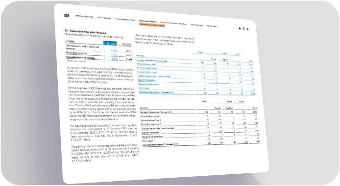 303 BMW Group Report 2024 To Our Stakeholders Combined Management Report Group Financial Statements Responsibility Statement and Auditor’s Report Remuneration Report Other Information Notes to the Group Financial Statements 25 Receivables from sales financing Receivables from sales financing comprise the following: in € million 31.12.2024 31.12.2023 Credit financing for retail customers and dealerships* 70,121 65,733 Finance lease receivables 23,597 21,622 Receivables from sales financing 93,718 87,355 * Including operating leases. As part of its ABS financing activities, the BMW Group transfers some of its receivables from sales financing – primarily retail cus- tomer and dealership financing receivables – to structured com- panies, which in turn securitise them and place them on the cap- ital market as collateralised securities. For the purposes of ABS financing, only the senior tranches of the issued securities are sold to external investors. Subordinated tranches are retained by the BMW Group. Furthermore, the BMW Group retains the exposure to interest rate risk in many transac- tions for which it concludes corresponding interest rate deriva- tives. The risk of delayed payments by debtors is reduced in the majority of ABS financing agreements by cash reserves financed by the BMW Group. Due to the risks remaining with the BMW Group, the ABS financing arrangements did not result in the de- recognition of the securitised financial assets. The carrying amount of receivables from sales financing trans- ferred but not derecognised at 31 December 2024 stood at € 15,758 million (2023: € 15,152 million). The fair value of those receivables at that date was € 16,038 million (2023: € 15,332 million). The carrying amount of the corresponding liabilities from asset- backed financing transactions at 31 December 2024 stood at € 12,580 million (2023: € 12,089 million). The fair value of these liabilities at that date was € 12,735 million (2023: € 12,148 million). Impairment allowances on receivables from sales financing in accordance with IFRS 9, which only arise within the Financial Services segment, developed as follows: Stage 1 Stage 2 Stage 3 in € million General Simplified Total Impairment allowances at 1 January 2024 581 929 36 643 2,189 Reclassification to Stage 1 7 – 75 – – 3 – 71 Reclassification to Stage 2 – 23 253 – – 43 187 Reclassification to Stage 3 – 5 – 72 – 2 302 223 Derecognition and origination of receivables 43 14 1 – 9 49 Write-off of receivables – 1 – 30 – 1 – 184 – 216 Changes in risk parameters – 9 7 – 9 7 Other changes – 51 – 35 – 4 47 – 43 Impairment allowances at 31 December 2024 542 991 30 762 2,325 Stage 1 Stage 2 Stage 3 in € million General Simplified Total Impairment allowances at 1 January 2023 576 935 35 599 2,145 Reclassification to Stage 1 5 – 47 – – 1 – 43 Reclassification to Stage 2 – 23 234 – – 39 172 Reclassification to Stage 3 – 3 – 52 – 1 215 159 Derecognition and origination of receivables 54 26 2 – 20 62 Write-off of receivables – 1 – 24 – 1 – 98 – 124 Changes in risk parameters – 8 – 5 – 1 – 2 – 16 Other changes – 19 – 138 2 – 11 – 166 Impairment allowances at 31 December 2023 581 929 36 643 2,189