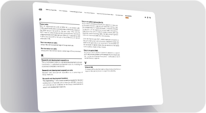 429 BMW Group Report 2024 To Our Stakeholders Combined Management Report Group Financial Statements Responsibility Statement and Auditor’s Report Remuneration Report Other Information Glossary P Payout ratio Ratio of unappropriated profit of BMW AG in accordance with HGB to profit attributable to shareholders of BMW AG, based on the BMW Group’s net profit for the year under IFRS. Until the 2021 financial year, the payout ratio corresponded to the ratio of unappropriated profit belonging to BMW AG in accordance with HGB to the net profit for the year of the BMW Group in accord- ance with IFRS. Post-tax return on sales Group net profit as a percentage of Group revenues. Pre-tax return on sales Group profit / loss before tax as a percentage of Group revenues. R Research and development expenditure The sum of research and non-capitalised development costs and investments in capitalised development costs not including the associated scheduled amortisation. Research and development expenditure ratio Research and development expenditure as a percentage of Group revenues. Research and development locations The engineering, IT and process expertise required for the (pre-) development of hardware and software for all BMW Group prod- ucts and services is combined at the Group’s international re- search and development locations. Return on capital employed (RoCE) RoCE in the Automotive and Motorcycles segments is measured on the basis of relevant segment profit before financial result and the average amount of capital employed – at the end of the last five quarters – in the segment concerned. Capital employed cor- responds to the sum of intangible assets, property, plant and equipment and net working capital, the latter comprising inven- tories and trade receivables less trade payables. Up to the financial year 2021, capital employed corresponds to the sum of all current and non-current operational assets, less liabilities that generally do not incur interest. The deductible cap- ital consisted of capital shares that are available to the opera- tional business, largely without interest. Return on equity (RoE) RoE in the Financial Services segment is calculated as segment profit before taxes, divided by the average amount of equity cap- ital – at the end of the last five quarters – attributable to the Fi- nancial Services segment. V Value at risk A measure of the potential maximum loss in value of an item dur- ing a set time period, based on a specified probability.