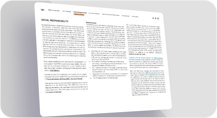 161 BMW Group Report 2024 To Our Stakeholders Combined Management Report Group Financial Statements Responsibility Statement and Auditor’s Report Remuneration Report Other Information Sustainability Statement SOCIAL RESPONSIBILITY As a global company, the BMW Group takes social responsibility. This includes, in particular, adherence with environmental and social standards along the entire value chain. The BMW Group works in close cooperation with the General Works Council to up- hold fair working conditions and respect for human rights, not only for our own employees, but also by suppliers and other busi- ness partners, such as sales partners. The BMW Group pursues a holistic approach in this regard. In addition to committing itself to meeting high social standards, it also takes action to enable that these are met along the entire value chain. In this way, the BMW Group assumes responsibility in areas beyond its own op- erations. As a global premium manufacturer of automobiles and motorcycles with a multinational workforce on all continents, the BMW Group has close ties with the societies in which it operates. There, the Company also enters into local long-term voluntary social commitments. Encouraging employees and ensuring their development is a core aspect of the BMW Group’s social responsibility. The Com- pany fosters a forward-looking and inclusive working environ- ment that offers individual training and further education oppor- tunities ↗ Own Workforce. Information about the multistage due diligence process regard- ing respect for human rights in the supplier network can be found in ↗ Social and Environmental Responsibility in the Supplier Network. High-quality products and transparent behaviour are of central importance to the BMW Group. The BMW Group focuses on meeting the needs of its customers and providing them with a unique experience. More information about this can be found at ↗ Consumers and End-Users. Basis for action The BMW Group is committed to respecting human rights and the associated environmental standards. This applies not only to our own business activities, but also to our relationships with suppliers and other business partners. The BMW Group uses clearly defined responsibilities and targeted actions to safeguard these fundamental rights. In 2005, the BMW Group reaffirmed its position in a joint declaration on human rights and working conditions, which was signed by the Board of Management and employee representatives. Multistage due diligence processes enable that internationally recognised standards are met. In ad- dition to country-specific requirements, the BMW Group takes the following international standards into account in particular: — International Bill of Human Rights, consisting of the United Nations Universal Declaration of Human Rights, as well as the International Covenant on Civil and Political Rights (IC- CPR) and the International Covenant on Economic, Social and Cultural Rights (ICESCR) — UN Guiding Principles on Business and Human Rights — International Labour Organization (ILO) Declaration on Fun- damental Principles and Rights at Work — ILO Tripartite Declaration of Principles concerning Multina- tional Enterprises and Social Policy (MNE Declaration) and ILO Convention 169 — Organisation for Economic Cooperation and Development (OECD) Guidelines for Multinational Companies and the, — Ten Principles of the UN Global Compact. The Human Rights Officer assumes an overarching manage- ment role within the BMW Group. In this role, the Human Rights Officer monitors the implementation of the risk management measures provided for in the German Supply Chain Due Dili- gence Act. The Human Rights Officer liaises closely with the rel- evant departments and reports directly to the Board of Manage- ment on a regular basis as well as on an ad hoc basis. Within the BMW Group, the Compliance function is responsible for the over- arching concept to ensure compliance with human rights and the associated environmental standards. In addition, the Compliance function coordinates the due diligence processes not only within its own business area, but also with other business partners, such as the dealership organisations. The BMW Group’s Compli- ance Management System (CMS) provides the organisational framework for adhering to the significant requirements. » Compliance and notification systems In addition to the international standards, the ↗ BMW Group Code on Human Rights and Working Conditions applies to our own business op- erations as well as our suppliers and other business partners. The respective responsible units (such as BMW Group depart- ments or companies) and business partners are responsible for complying with human rights due diligence obligations. Within the BMW Group, managers are responsible for imple- menting this Code and the ↗ BMW Group Code of Conduct in their own areas. They are obliged to inform employees about the content and significance of the Codes, in addition to advising them and supporting them with the application of the Codes’ principles in their daily work. Every employee must ensure that they are in compliance with the requirements related to human rights and working conditions and make sure that their professional conduct is in alignment with those principles. The BMW Group has estab- lished taking social responsibility as a prerequisite for prospec- tive business partners. Human rights-related and environmental due diligence obligations are incorporated into dealership and agency contracts for example.