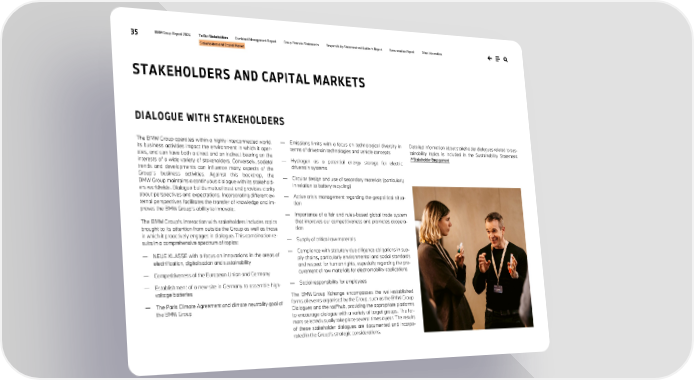 35 BMW Group Report 2024 To Our Stakeholders Combined Management Report Group Financial Statements Responsibility Statement and Auditor’s Report Remuneration Report Other Information Stakeholders and Capital Market sTT DIALOGUE WITH STAKEHOLDERS The BMW Group operates within a highly interconnected world. Its business activities impact the environment in which it oper- ates, and can have both a direct and an indirect bearing on the interests of a wide variety of stakeholders. Conversely, societal trends and developments can influence many aspects of the Group’s business activities. Against this backdrop, the BMW Group maintains a continuous dialogue with its stakehold- ers worldwide. Dialogue builds mutual trust and provides clarity about perspectives and expectations. Incorporating different ex- ternal perspectives facilitates the transfer of knowledge and im- proves the BMW Group’s ability to innovate. The BMW Group’s interaction with stakeholders includes topics brought to its attention from outside the Group as well as those in which it proactively engages in dialogue. This combination re- sults in a comprehensive spectrum of topics: — NEUE KLASSE with a focus on innovations in the areas of electrification, digitalisation and sustainability — Competitiveness of the European Union and Germany — Establishment of a new site in Germany to assemble high- voltage batteries — The Paris Climate Agreement and climate neutrality goal of the BMW Group — Emissions limits with a focus on technological diversity in terms of drivetrain technologies and vehicle concepts — Hydrogen as a potential energy storage for electric drivetrain systems — Circular design and use of secondary materials (particularly in relation to battery recycling) — Active crisis management regarding the geopolitical situa- tion — Importance of a fair and rules-based global trade system that improves our competitiveness and promotes coopera- tion — Supply of critical raw materials — Compliance with statutory due diligence obligations in sup- ply chains, particularly environmental and social standards and respect for human rights, especially regarding the pro- curement of raw materials for electromobility applications — Social responsibility for employees The BMW Group Xchange encompasses the well-established forms of events organised by the Group, such as the BMW Group Dialogues and the rad°hub, providing the appropriate platforms to encourage dialogue with a variety of target groups. The for- mats selected usually take place several times a year. The results of these stakeholder dialogues are documented and incorpo- rated in the Group’s strategic considerations. Detailed information about stakeholder dialogues related to sus- tainability topics is included in the Sustainability Statement. ↗ Stakeholder Engagement STAKEHOLDERS AND CAPITAL MARKETS