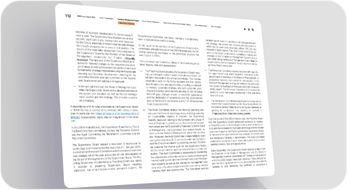 112 BMW Group Report 2024 To Our Stakeholders Combined Management Report Group Financial Statements Responsibility Statement and Auditor’s Report Remuneration Report Other Information Sustainability Statement planning of business development for the following fi- nancial year. The Supervisory Board addresses all stra- tegically significant plans, transactions and measures for the Group, especially if these fundamentally change the Group’s prospects for success or risk position. The results of the materiality assessment are presented to the Supervisory Board by the Member of the Board of Management responsible for Finance ↗ Materiality Assessment. The approval of the Supervisory Board is re- quired for material changes to the corporate and prod- uct strategy as well as important transactions that are of fundamental strategic importance. Long-term corporate planning and business development planning for the upcoming financial year are submitted to the Supervi- sory Board on an annual basis for approval. — In the annual risk report, the Board of Management pro- vides the Supervisory Board with a detailed overview of the current risk situation, as well as the risk manage- ment system and risk strategy. This includes sustaina- bility matters. In accordance with its rules of procedure, the Supervisory Board of BMW AG has a number of committees with different duties (see in particular the ↗ Rules of Procedure of the Supervisory Board of BMW AG). Sustainability topics play an integral part in this struc- ture. In the 2024 financial year, the Supervisory Board had a Presid- ing Board and four committees, namely the Personnel Commit- tee, the Audit Committee, the Nomination Committee and the Mediation Committee. The Supervisory Board passed a resolution to restructure its committees and implemented the resolution on 1 January 2025. Instead of the Personnel Committee a Remuneration Committee was created, which focuses exclusively on the remuneration of the Board of Management and the Supervisory Board. The Pre- siding Board was transferred to a Presiding Committee, which, in addition to preparing Supervisory Board meetings, addresses non-remuneration-related personnel matters. The Remuneration Committee has seven members, strengthening both its independence and its diversity. As the report on the activities of the Supervisory Board and its committees primarily focuses on the 2024 financial year, the fol- lowing disclosures are based on the committee structure that was in place in 2024. The committees are involved as follows in the monitoring of ma- terial impacts, risks and opportunities: — The Presiding Board prepares the Supervisory Board meet- ings, assuming the subject matter to be discussed does not fall within the remit of any of the Committees. This includes preparatory work on the following topics and their associ- ated impacts, risks and opportunities, including sustainabil- ity matters: corporate strategy, long-term corporate plan- ning and business development planning for the following financial year; changes related to corporate governance; and the declaration of compliance with the recommenda- tions of the DCGK in accordance with § 161 of the German Stock Corporation Act . — The Audit Committee reviews the financial reporting and oversees the financial reporting process, including reporting on sustainability matters. It prepares the Supervisory Board’s resolution relating to the Company and Group Fi- nancial Statements, and discusses the combined manage- ment report and the Sustainability Statement with the Board of Management. The Committee also reviews interim re- ports with the Board of Management before their publica- tion. Moreover, the Audit Committee is responsible for over- seeing the external audit. In connection with the Company’s and the Group’s sustainability reporting, the Audit Commit- tee prepares the internal audit for the Supervisory Board, decides on an external audit and commissions an external auditor. The Audit Committee is responsible for monitoring the effectiveness of the internal control system, including the internal audit system and the internal Compliance Manage- ment System, as well as the internal risk management sys- tem, and is therefore deeply involved in monitoring material impacts, risks and opportunities. The Committee receives detailed reports every six months on risk management and risk strategy, the current risk situation, and the extent to which the risk cover funds have been utilised. ESG risks are included in these reports. The Chief Compliance Officer re- ports to the Audit Committee on compliance matters and changes to the Compliance Management System twice a year while taking the Board of Management’s due diligence responsibilities into consideration. He also reports to the Su- pervisory Board once a year. — The Personnel Committee prepares decisions with regard to the appointment and, where applicable, revocation of the appointment of members of the Board of Management. Its preparatory activities also extend to remuneration of the Board of Management and regular review of the remunera- tion system for the Board of Management in light of sustain- ability targets. The Personnel Committee also monitors the extent to which the targets established in this area have been achieved. — The Nomination Committee prepares election proposals for shareholder representatives on the Supervisory Board for the Annual General Meeting while taking the objectives re- garding its composition into account, as outlined in ↗ Supervisory Board - Composition, diversity, expertise. Over the course of the 2024 financial year, the Presiding Board and the Supervisory Board addressed sustainability matters, with a particular focus on the progress being made in electromo- bility and the prospects for hydrogen technology and the circular economy. A report to the Presiding Board and Supervisory Board at the end of the year addressed key strategi
