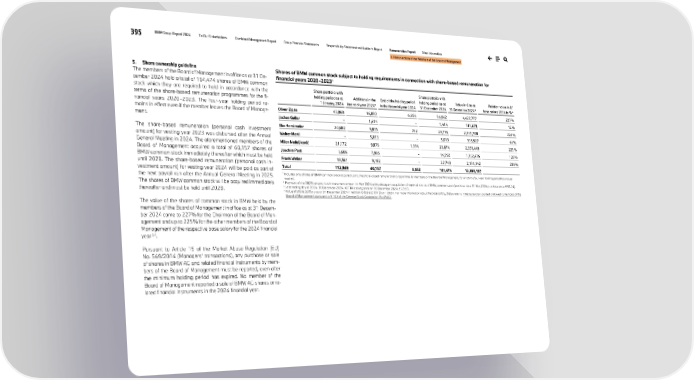 395 BMW Group Report 2024 To Our Stakeholders Combined Management Report Group Financial Statements Responsibility Statement and Auditor’s Report Remuneration Report Other Information II. Remuneration of the Members of the Board of Management 5. Share ownership guideline The members of the Board of Management in office as at 31 De- cember 2024 hold a total of 164,474 shares of BMW common stock which they are required to hold in accordance with the terms of the share-based remuneration programmes for the fi- nancial years 2020–2023. The four-year holding period re- mains in effect even if the member leaves the Board of Manage- ment. The share-based remuneration (personal cash investment amount) for vesting year 2023 was disbursed after the Annual General Meeting in 2024. The aforementioned members of the Board of Management acquired a total of 60,157 shares of BMW common stock immediately thereafter which must be held until 2028. The share-based remuneration (personal cash in- vestment amount) for vesting year 2024 will be paid as part of the next payroll run after the Annual General Meeting in 2025. The shares of BMW common stock will be acquired immediately thereafter and must be held until 2029. The value of the shares of common stock in BMW held by the members of the Board of Management in office as at 31 Decem- ber 2024 came to 227% for the Chairman of the Board of Man- agement and up to 225% for the other members of the Board of Management of the respective base salary for the 2024 financial year 3,4. Pursuant to Article 19 of the Market Abuse Regulation (EU) No. 569/2014 (Managers’ transactions), any purchase or sale of shares in BMW AG and related financial instruments by mem- bers of the Board of Management must be reported, even after the minimum holding period has expired. No member of the Board of Management reported a sale of BMW AG shares or re- lated financial instruments in the 2024 financial year. Shares of BMW common stock subject to holding requirements in connection with share-based remuneration for financial years 2020–20231 Share portfolio with holding period as at 1 January 2024 Additions in the financial year 2024² End of the holding period in the financial year 2024 Share portfolio with holding period as at 31 December 2024 Value in € as at 31 December 2024³ Relation value in €/ base salary 2024 in %⁴ Oliver Zipse 45,868 16,890 6,696 56,062 4,427,777 227% Jochen Goller – 1,414 – 1,414 111,678 12% Ilka Horstmeier 20,682 9,876 782 29,776 2,351,708 224% Walter Mertl – 5,013 – 5,013 395,927 44% Milan Nedeljković 21,172 9,876 1,174 29,874 2,359,449 225% Joachim Post 6,686 7,906 – 14,592 1,152,476 128% Frank Weber 18,561 9,182 – 27,743 2,191,142 209% Total 112,969 60,157 8,652 164,474 12,990,157 1 Includes only shares of BMW common stock acquired using the share-based remuneration programme for members of the Board of Management, for which the four-year holding period has not yet expired. 2 Payment of the 2023 personal cash investment amount in May 2024 with subsequent acquisition of reported shares of BMW common stock (purchase date: 31 May 2024; purchase price: € 92.74). 3 Last trading day of 2024: 30 December 2024. XETRA closing price on 30 December 2024: € 78.98. 4 Value of share portfolio as at 31 December 2024 in relation to base salary paid in 2024. For more information about the base salary, please refer to ↗ Remuneration granted and owed to members of the Board of Management pursuant to § 162 of the German Stock Corporation Act (AktG).