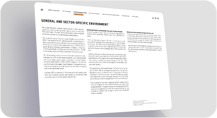 67 BMW Group Report 2024 To Our Stakeholders Combined Management Report Group Financial Statements Responsibility Statement and Auditor’s Report Remuneration Report Other Information Financial Performance GENERAL AND SECTOR-SPECIFIC ENVIRONMENT * The global economy showed stable growth in 2024 and ex- panded by 3.2% overall. Significant impetus came from the USA, China and India. In Europe, the economy grew slightly compared to the previous year but remained below expectations. The eurozone’s gross domestic product (GDP) rose by 0.7% in 2024. The reasons for this subdued growth included higher in- terest rates and the restrained decline in consumer spending. In Germany, the situation was exacerbated by a 0.2% decline in export demand. Economic performance in France (+1.1%), Italy (+0.5%) and Spain (+3.2%) was more robust in 2024. The UK economy also grew by 0.9% compared to the previous year. The US economy proved very resilient despite high interest rates and grew by 2.8% in the reporting period. Low unemployment and rising wages gave private consumption a boost. China’s economy expanded by 5.0% in 2024, exactly in line with the country’s economic targets. Nevertheless, China’s economy con- tinues to be impacted by weak domestic demand and an ongoing crisis in the real estate sector. In Japan, GDP just grew by 0.1% compared to the previous year. Here, too, economic growth was slowed by persistently weak consumer demand and relatively high inflation. Declining inflation and interest rate cuts in many markets Amid falling inflation rates, many central banks began gradually lowering their benchmark interest rates from mid-2024 on- wards. The euro fluctuated between 1.04 and 1.12 US dollars to the euro, with an average annual exchange rate of 1.08 US dollars to the euro. The British pound strengthened slightly in 2024 compared to the previous year, trading between 0.82 and 0.86 pounds to the euro, with an average rate of 0.85 pounds to the euro. China’s central bank lowered some key benchmark interest rates during the reporting year with the aim of strengthening the weak- ening economy and supporting the crisis-hit real estate market. The Chinese renminbi fluctuated between 7.62 and 7.88 renminbi to the euro in 2024 and averaged 7.79 renminbi to the euro over the year. The Japanese yen fluctuated between 159 and 172 yen to the euro in 2024. With an average exchange rate of 164 yen, the Japanese currency continued to fall in value against the euro compared to the previous year. The South Korean won weak- ened slightly year on year and traded between 1,437 and 1,508 won to the euro, with an average rate of 1,475 won to the euro. The currencies of the major emerging markets changed little in some cases against the euro. While the Indian rupee depreciated by approximately 1% against the euro on average, the South Af- rican rand strengthened by 0.6%. By contrast, the Brazilian real recorded a significant decline against the euro and traded 8% lower on average. Energy and raw materials prices continue to fall The price of energy and raw materials continued to fall in 2024 in many areas, particularly for steel and the raw materials used to produce batteries. Prices for cobalt and lithium were even be- low the long-term average. By contrast, copper and aluminium prices rose slightly during the reporting period. Despite the crisis in the Middle East, average crude oil prices con- tinued to fall in 2024. US WTI crude fluctuated between 69 and 85 USD per barrel, while Brent crude traded between 73 and 91 USD per barrel. * Growth rates: Source: Focus Economics. Exchange rates: Source: ECB. Energy and raw material prices: Sources: CRU, LME, Fastmarkets. Oil price: Source: Weltbank.