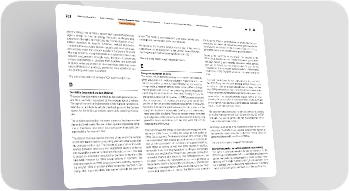 203 BMW Group Report 2024 To Our Stakeholders Combined Management Report Group Financial Statements Responsibility Statement and Auditor’s Report Remuneration Report Other Information Sustainability Statement delivery notes), nor is there a government-operated/regulatory registry similar to that for Energy Attributes Certificates (e.g. guarantees of origin) that facilitates the distinct allocation of sec- ondary materials to specific customers without duplication. Therefore, the secondary material quota is confirmed using sys- tem extracts from the relevant suppliers’ Enterprise Resource Planning systems, along with details and evidence of secondary material procurement through mass balances. Furthermore, written confirmation is obtained from suppliers and upstream suppliers in the value chain to clearly attribute secondary mate- rials to BMW Group products, preventing any possibility of dou- ble-counting with other customers. The unit of the metric is tonnes of CO2 equivalent [t CO2e]. D Durability (expected product lifetime) This non-financial metric is defined as the average expected ser- vice life of vehicles, expressed as the average age of a vehicle. The age of the vehicle is determined on the basis of the data pro- vided by our end-of-life vehicle take-back points in the German market for BMW Group vehicles taken back, excluding motorcy- cles. The vehicles recorded for the metric are those that have reached the end of their useful life due to their age and irreparable condi- tion, or that have been taken back because of irreparable dam- age resulting from an accident. The date of first registration, the time of return and the number of vehicles taken back in a reporting year are used to calculate the average vehicle age. The calculated age of all vehicles (dif- ference between return and first registration date) is added up and divided by the total number of vehicles taken back. The data is based on information provided by partners in the end-of-life take-back network for BMW Group vehicles in Germany. The data originate from BMW Group take-back partners, represent- ing around 10% of all dismantling companies licensed in Ger- many. This is primary data. The partners provide the data once a year. The metric is hence collected once every calendar year and relates to the year prior to the reporting year. Furthermore, the industry average vehicle age in Germany is stated based on data supplied by the German Federal Environ- ment Agency (Umweltbundesamt) (data as per 2021). The unit of the metric is age indicated in years. E Energy consumption and mix The metric results from the energy consumption generated by BMW Group plants, in vehicle production, motorcycle and com- ponent production as well as other BMW Group non-manufac- turing sites (e.g. research centres, sales centres, office buildings). Partner plants and contract manufacturing are not included be- cause they are not consolidated financially. Starting in 2024, the energy consumption of third parties on BMW production sites will also be measured. This includes the energy consumed by third parties on the site, provided production equipment is not owned by the BMW Group, the employees work for third parties and the equipment is either in a separate building or in a clearly sepa- rated area within a building. This also includes energy consumed by third parties on the site while construction work is being com- pleted for future production up to the point when risk is trans- ferred to the BMW Group. The metric shows the energy consumption per energy source for the entire BMW Group, including the supply of third parties at BMW Group locations. Total energy consumption consists of the fuel consumption from natural gas and petroleum products, as well as the consumption of purchased or acquired electricity, heat, steam or cooling derived from fossil sources. In addition, renewable fuels, including wood fuel, landfill gas, biomethane and the consumption of purchased heat, steam and cooling from renewable sources, plus electricity from renewable sources, are included. The electricity from renewable sources is generated by the company itself via photovoltaic installations, or sourced from power purchase agreements (PPA) and Energy Attributes Certif- icates (e.g. guarantees of origin). The BMW Group generally calculates the share of electricity from renewable sources con- servatively, i.e. shares of renewable power generation in the electricity mix are not used for the calculation. Electricity from co- generation plants is counted as natural gas consumption. Some of the electricity in the energy mix supplied to the BMW Group may be sourced from nuclear power plants. From the 2024 reporting year onwards, the corresponding percent- ages will be derived from the statistical data for each country. These are provided worldwide by the Association of the Automo- tive Industry (VDA). The BMW Group uses the currently valid ver- sion. The metric also includes the non-manufacturing sites over which the BMW Group has exclusive financial control. Energy con- sumption for the sites is extrapolated based on the gross floor area (GFA) and the type of use. The extrapolation is based on an evaluation of the non-manufacturing sites for which primary data are recorded. The extrapolated consumption metrics are then added to the consumption of purchased electricity, heat, steam or cooling from fossil sources. All other sites are recorded on the basis of meter data or invoice values. The data from production sites included in the metric is certified by the Eco Management and Audit Scheme (EMAS), ISO 14001 and partly ISO 50001. Some of the non-manufacturing sites in- cluded in the metric are certified. All energy values stated in the report are based on the lower cal- orific value. The BMW Group uses the currently valid version of the conversion factors issued by the German Federal Office for Economic Affairs and Export Control (BAFA). The unit of the metric 