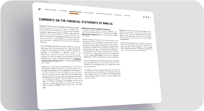 87 BMW Group Report 2024 To Our Stakeholders Combined Management Report Group Financial Statements Responsibility Statement and Auditor’s Report Remuneration Report Other Information Financial Performance COMMENTS ON THE FINANCIAL STATEMENTS OF BMW AG Bayerische Motoren Werke Aktiengesellschaft (BMW AG), based in Munich, Germany, is the parent company of the BMW Group. The comments on the BMW Group and Automotive segment provided in earlier sections apply to BMW AG, unless presented differently in the following section. The Financial Statements of BMW AG are drawn up in accordance with the provisions of the German Commercial Code (HGB) and the relevant supplemen- tary requirements contained in the German Stock Corporation Act (AktG). The key financial performance indicator for BMW AG is the divi- dend payout ratio. This corresponds to the unappropriated profit of BMW AG in accordance with HGB in relation to the profit at- tributable to shareholders of BMW AG, based on the BMW Group’s net profit for the year. The key non-financial per- formance indicators are identical and concurrent with those of the BMW Group. These are described in detail in the ↗ Comparison of Forecasts with actual Outcomes section of the Combined Manage- ment Report. Differences in accounting treatments based on HGB (used for the Company Financial Statements) and the International Finan- cial Reporting Standards (IFRS) as adopted by the European Un- ion (used for the Group Financial Statements) are mainly to be found in connection with the capitalisation of intangible assets, the measurement of property, plant and equipment and invento- ries, the creation of valuation units, the recognition and measure- ment of financial instruments and provisions as well as the recognition of deferred tax. Differences also arise in the presen- tation of assets and liabilities and of items in the income state- ment. Business environment and review of operations The general and sector-specific environment of BMW AG is the same as that of the BMW Group and is described in the ↗ General and Sector-specific Environment section of the Combined Manage- ment Report. BMW AG develops, manufactures and sells automobiles and motorcycles as well as spare parts and accessories manufac- tured in house, by foreign subsidiaries and by external suppliers, and performs services related to these products. Sales activities are carried out primarily through branches, subsidiaries, inde- pendent dealerships, agents and importers. Automobile deliver- ies decreased by 73,330 units to 2,547,590 units in the finan- cial year 2024. This figure includes 586,016 units relating to se- ries sets supplied to BMW Brilliance Automotive Ltd., Shenyang, a decrease of 106,251 units compared with the previous year. As at 31 December 2024, BMW AG had 87,823 employees, plus 5,942 apprentices, interns and thesis students (31 Decem- ber 2023: 85,168 employees, plus 5,733 apprentices, interns and thesis students). The BMW Group had a strong first half of 2024 in line with ex- pectations. Business then slowed over the remainder of the year due to delivery stops and recalls linked to the Integrated Brake System (IBS) provided by a supplier, as well as ongoing muted demand in China. Maintaining a consistent focus on technology openness allows the BMW Group to develop innovative drive technologies and to respond in a flexible manner to market developments. BMW AG believes it is well-positioned on the basis of its robust strategy, balanced product range and continuous investment in research and development. BMW AG’s solid financial condition is reflected in the results of operations, financial position and net assets reported for the fi- nancial year 2024. Business developed in line with manage- ment’s adjusted expectations. This assessment also takes into account events after the end of the reporting period.