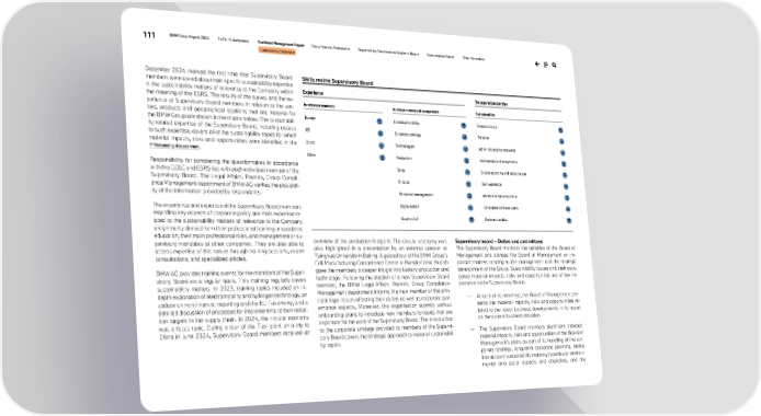 111 BMW Group Report 2024 To Our Stakeholders Combined Management Report Group Financial Statements Responsibility Statement and Auditor’s Report Remuneration Report Other Information Sustainability Statement December 2024 marked the first time that Supervisory Board members were asked about their specific sustainability expertise in the sustainability matters of relevance to the Company within the meaning of the ESRS. The results of the survey and the ex- perience of Supervisory Board members in relation to the sec- tors, products and geographical locations that are material for the BMW Group are shown in the matrix below. The sustainabil- ity-related expertise of the Supervisory Board, including access to such expertise, covers all of the sustainability topics for which material impacts, risks and opportunities were identified in the ↗ Materiality Assessment. Responsibility for completing the questionnaires in accordance with the GCGC and ESRS lies with each individual member of the Supervisory Board. The Legal Affairs, Patents, Group Compli- ance Management department of BMW AG verifies the plausibil- ity of the information provided by respondents. The experience and expertise of the Supervisory Board members regarding key aspects of corporate policy and their expertise re- lated to the sustainability matters of relevance to the Company are primarily derived from their professional training or academic education, their main professional roles, and management or su- pervisory mandates at other companies. They are also able to access expertise of this nature through training sessions, expert consultations, and specialized articles. BMW AG provides training events for the members of the Super- visory Board on a regular basis. This training regularly covers sustainability matters. In 2023, training topics included an in- depth exploration of electromobility and hydrogen technology, an update on non-financial reporting and the EU Taxonomy, and a detailed discussion of processes for implementing carbon reduc- tion targets in the supply chain. In 2024, the circular economy was a focus topic. During a tour of the Tiexi plant on a trip to China in June 2024, Supervisory Board members received an overview of the production footprint. The circular economy was also highlighted in a presentation by an external speaker at Tsinghua University in Beijing. A guided tour of the BMW Group’s Cell Manufacturing Competence Centre in Parsdorf near Munich gave the members a deeper insight into battery production and technology. Following the election of a new Supervisory Board member, the BMW Legal Affairs, Patents, Group Compliance Management department informs the new member of the prin- cipal legal issues affecting their duties as well as corporate gov- ernance aspects. Moreover, the organisation submits various onboarding plans to introduce new members to topics that are important for the work of the Supervisory Board. The introduction to the corporate strategy provided to members of the Supervi- sory Board covers the strategic approach to material sustainabil- ity topics. Supervisory board – Duties and committees The Supervisory Board monitors the activities of the Board of Management and advises the Board of Management on im- portant matters relating to the management and the strategic development of the Group. Sustainability issues and their asso- ciated material impacts, risks and opportunities are of key im- portance to the Supervisory Board. — At each of its meetings, the Board of Management pre- sents the material impacts, risks and opportunities re- lated to the latest business developments in its report on the current business situation. — The Supervisory Board monitors significant selected material impacts, risks and opportunities of the Board of Management’s plans as part of its handling of the cor- porate strategy, long-term corporate planning, taking into account sustainability matters, in particular environ- mental and social aspects and objectives, and the Experience (Access to) expertise In relevant markets In relevant areas of competence Sustainability Europe Individual mobility Climate change US Corporate strategy Pollution China Technologies Water and marine resources Other Production Biodiversity and ecosystems Sales Circular economy and resource use Finance Own workforce Personnel management Workers in the value chain Digitalisation Consumers and end-users Supply chain Business conduct Skills matrix Supervisory Board
