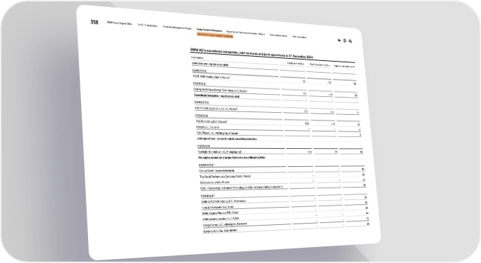 358 BMW Group Report 2024 To Our Stakeholders Combined Management Report Group Financial Statements Responsibility Statement and Auditor’s Report Remuneration Report Other Information Notes to the Group Financial Statements BMW AG’s associated companies, joint ventures and joint operations at 31 December 2024 Companies Equity in € million Profit/loss in € million Capital investment in % Joint ventures - equity accounted D O M E S T I C YOUR NOW Holding GmbH, Munich8 66 – 30 50 F O R E I G N Beijing Ionchi New Energy Technology Ltd., Beijing8 166 – 18 50 Associated companies - equity accounted – – - D O M E S T I C IONITY Holding GmbH & Co. KG, Munich8 725 – 62 15 F O R E I G N THERE Holding B.V., Rijswijk8 959 – 11 31 IONNA LLC, Torrance – – 14 Solid Power, Inc., Wilmington, Delaware – – 6 Joint operations - proportionately consolidated entities F O R E I G N Spotlight Automotive Ltd., Zhangjiagang8 128 33 50 Not equity accounted or proportionately consolidated entities D O M E S T I C 7 Encory GmbH, Unterschleissheim – – 50 The Retail Performance Company GmbH, Munich – – 50 IDEALworks GmbH, Munich – – 49 PDB - Partnership for Dummy Technology and Biomechanics GbR, Gaimersheim – – 20 F O R E I G N 7 BMW AVTOTOR Holding B.V., Amsterdam – – 50 Critical TechWorks S.A., Porto – – 50 BMW Albatha Finance PSC, Dubai – – 40 BMW Albatha Leasing, LLC, Dubai – – 40 ChargeScape, LLC, Wilmington, Delaware – – 33 Bavarian & Co Co., Ltd., Incheon – – 20