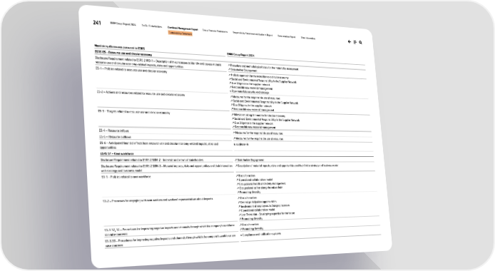 241 BMW Group Report 2024 To Our Stakeholders Combined Management Report Group Financial Statements Responsibility Statement and Auditor’s Report Remuneration Report Other Information Sustainability Statement Mandatory discosures pursuant to ESRS BMW Group Report 2024 ESRS E5 – Resource use and circular economy Disclosure Requirement related to ESRS 2 IRO-1 – Description of the processes to identify and assess material resource use and circular economy-related impacts, risks and opportunities ↗ Procedure and methodological basis for the materiality assessment ↗ Stakeholder Engagement E5-1 – Policies related to resource use and circular economy ↗ Holistic approach for the transition to a circular economy ↗ Social and Environmental Responsibility in the Supplier Network ↗ Due Diligence in the supplier network ↗ Responsible raw material management » Raw materials security and strategy E5-2 – Actions and resources related to resource use and circular economy ↗ Measures for the responsible use of resources ↗ Social and Environmental Responsibility in the Supplier Network ↗ Due Diligence in the supplier network ↗ Responsible raw material management E5-3 – Targets related to resource use and circular economy ↗ Milestones along the road to the circular economy ↗ Social and Environmental Responsibility in the Supplier Network ↗ Due Diligence in the supplier network ↗ Responsible raw material management E5-4 – Resource inflows ↗ Measures for the responsible use of resources E5-5 – Resource outflows ↗ Measures for the responsible use of resources E5-6 – Anticipated financial effects from resource use and circular economy-related impacts, risks and opportunities n. a./phase-in ESRS S1 – Own workforce Disclosure Requirement related to ESRS 2 SBM-2 – Interests and views of stakeholders ↗ Stakeholder Engagement Disclosure Requirement related to ESRS 2 SBM-3 – Material impacts, risks and opportunities and their interaction with strategy and business model ↗ Description of material impacts, risks and opportunities and their link to strategy and business model S1-1 – Policies related to own workforce ↗ Basis for action ↗ Operational collaboration model ↗ Occupational health and safety management ↗ Occupational safety along the value chain ↗ Promoting diversity S1-2 – Processes for engaging with own workers and workers’ representatives about impacts ↗ Basis for action ↗ Central participation opportunities ↗ Involvement of employees in change processes ↗ Operational collaboration model ↗ Just Transition - Developing expertise for the future ↗ Promoting diversity S1-3.32, 34 – Procedures for improving negative impacts and channels through which the company's workforce can raise concerns ↗ Basis for action ↗ Promoting diversity S1-3.33 – Procedures for improving negative impacts and channels through which the company's workforce can raise concerns » Compliance and notification systems