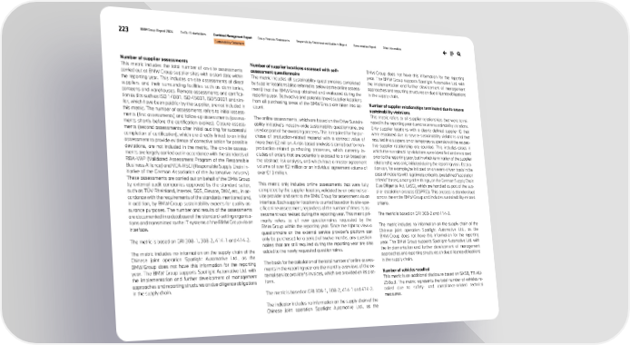 223 BMW Group Report 2024 To Our Stakeholders Combined Management Report Group Financial Statements Responsibility Statement and Auditor’s Report Remuneration Report Other Information Sustainability Statement Number of supplier assessments This metric includes the total number of on-site assessments carried out at BMW Group supplier sites with a start date within the reporting year. This includes on-site assessments of direct suppliers and their surrounding facilities such as dormitories, canteens and warehouses. Remote assessments and certifica- tion audits such as ISO 14001, ISO 45001, ISO 50001 and sim- ilar, which have been paid for by the supplier, are not included in this metric. The number of assessments refers to initial assess- ments (first assessments) and follow-up assessments (assess- ments shortly before the certification expires). Closure assess- ments (second assessments after initial auditing for successful completion of certification), which are directly linked to an initial assessment to provide evidence of corrective action for possible deviations, are not included in the metric. The on-site assess- ments are largely carried out in accordance with the standards of RBA-VAP (Validated Assessment Program of the Responsible Business Alliance) and VDA-RSCI (Responsible Supply Chain In- itiative of the German Association of the Automotive Industry). These assessments are carried out on behalf of the BMW Group by external audit companies approved by the standard setter, such as TÜV Rheinland, Intertek, SGS, Elevate, DNV, etc., in ac- cordance with the requirements of the standards mentioned and, in addition, by BMW Group sustainability experts for quality as- surance purposes. The number and results of the assessments are documented in a database of the standard-setting organisa- tions and transmitted to the IT systems of the BMW Group via an interface. The metric is based on GRI 308-1, 308-2, 414-1 and 414-2. The metric includes no information on the supply chain of the Chinese joint operation Spotlight Automotive Ltd., as the BMW Group does not have this information for the reporting year. The BMW Group supports Spotlight Automotive Ltd. with the implementation and further development of management approaches and reporting structures on due diligence obligations in the supply chain. Number of supplier locations assessed with self- assessment questionnaire The metric includes all sustainability questionnaires completed by supplier locations (also referred to below as the online assess- ment) that the BMW Group obtained and evaluated during the reporting year. Both active and potential (new) supplier locations from all purchasing areas of the BMW Group are taken into ac- count. The online assessments, which are based on the Drive Sustain- ability initiative's industry-wide sustainability questionnaire, are used as part of the awarding process. This is required for the pur- chase of production-related material with a contract value of more than €2 million. A risk-based analysis is carried out for non- production-related purchasing processes, which currently in- cludes all orders that are potentially exposed to a risk based on the abstract risk analysis, and which have a master agreement volume of over €2 million or an individual agreement volume of over €10 million. This metric only includes online assessments that were fully completed by the supplier location, validated by an external ser- vice provider and sent to the BMW Group for assessment via an interface. Each supplier location is counted based on its site-spe- cific online assessment, regardless of the number of times its as- sessment was revised during the reporting year. This metric pri- marily refers to all new questionnaires requested by the BMW Group within the reporting year. Since the right to view a questionnaire on the external service provider’s platform can only be purchased for a period of twelve months, any question- naires that are still required during the reporting year are also added to the newly requested questionnaires. The basis for the calculation of the total number of online assess- ments in the reporting year are the monthly overviews of the ex- ternal service provider’s invoices, which are provided on its plat- form. The metric is based on GRI 308-1, 308-2, 414-1 and 414-2. The indicator includes no information on the supply chain of the Chinese joint operation Spotlight Automotive Ltd., as the BMW Group does not have this information for the reporting year. The BMW Group supports Spotlight Automotive Ltd. with the implementation and further development of management approaches and reporting structures on due diligence obligations in the supply chain. Number of supplier relationships terminated due to severe sustainability violations This metric refers to all supplier relationships that were termi- nated in the reporting year due to severe sustainability violations. Only supplier locations with a clearly defined supplier ID that were escalated due to severe sustainability violations and that resulted in a suspension or temporary suspension of the respec- tive supplier relationship are counted. This includes cases in which the sustainability violations were identified and escalated prior to the reporting year, but in which termination of the supplier relationship was only initiated during the reporting year. Escala- tion can, for example, be initiated on an event-driven basis in the case of incidents with legitimate criticality (predefined "escalation criteria" based, among other things, on the German Supply Chain Due Diligence Act, LkSG), which are handled as part of the sup- plier escalation process (ESPRO). This process is standardised across the entire BMW Group and includes sustainability-related criteria. The metric is based on GRI 308-2 and 414-2. The metric includes no information on the supply chain of the Chinese joint operation Spotlight Automotive Ltd., as the BMW Group 