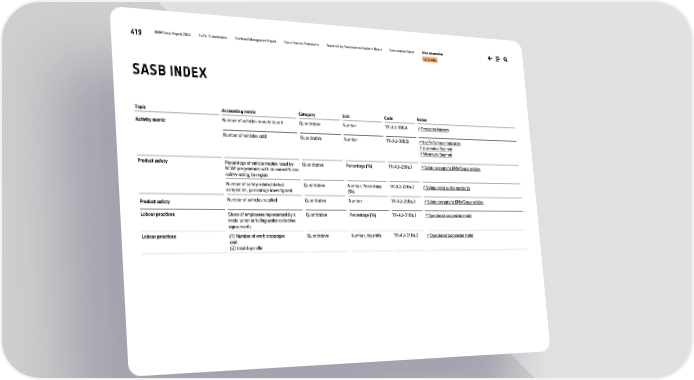 419 BMW Group Report 2024 To Our Stakeholders Combined Management Report Group Financial Statements Responsibility Statement and Auditor’s Report Remuneration Report Other Information SASB-Index Topic Accounting metric Category Unit Code Notes Activity metric Number of vehicles manufactured Quantitative Number TR-AU-000.A ↗ Production Network Number of vehicles sold Quantitative Number TR-AU-000.B ↗ Key Performance Indicators ↗ Automotive Segment ↗ Motorcycle Segment Product safety Percentage of vehicle models rated by NCAP programmes with an overall 5-star safety rating, by region Quantitative Percentage (%) TR-AU-250a.1 ↗ Safety concepts for BMW Group vehicles Number of safety-related defect complaints, percentage investigated Quantitative Number, Percentage (%) TR-AU-250a.2 ↗ Safeguarding quality standards Product safety Number of vehicles recalled Quantitative Number TR-AU-250a.3 ↗ Safety concepts for BMW Group vehicles Labour practices Share of employees represented by a trade union or falling under collective agreements Quantitative Percentage (%) TR-AU-310a.1 ↗ Operational cooperation model Labour practices (1) Number of work stoppages and (2) total days idle Quantitative Number, days idle TR-AU-310a.2 ↗ Operational cooperation model SASB INDEX