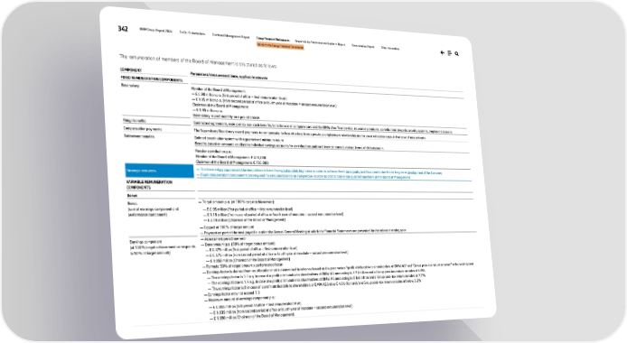 342 BMW Group Report 2024 To Our Stakeholders Combined Management Report Group Financial Statements Responsibility Statement and Auditor’s Report Remuneration Report Other Information Notes to the Group Financial Statements The remuneration of members of the Board of Management is structured as follows: COMPONENT Parameters/measurement base, applicable amounts FIXED REMUNERATION COMPONENTS Base salary Member of the Board of Management: — € 0.90 million p.a. (first period of office = first remuneration level) — € 1.05 million p.a. (from second period of office or fourth year of mandate = second remuneration level) Chairman of the Board of Management: — € 1.95 million p.a. Base salary is paid monthly on a pro rata basis Fringe benefits Contractual agreement, main points: non-cash benefits from the use of company cars and the BMW chauffeur service, insurance premiums, contributions towards security systems, employee discounts Compensation payments The Supervisory Board may award payments to compensate for loss of salary from a previous employment relationship and to cover relocation costs in the case of new entrants Retirement benefits Defined contribution system with a guaranteed minimum return Benefits based on amounts credited to individual savings accounts for contributions paid and interest earned, various forms of disbursement Pension contribution p.a.: Member of the Board of Management: € 400,000 Chairman of the Board of Management: € 700,000 Strategic relevance — The base salary counteracts the temptation to take disproportionately high risks in order to achieve short-term goals, and thus contributes to the long-term development of the Company — Fixed remuneration components are required for remuneration to be competitive in order to attract and retain qualified members of the Board of Management VARIABLE REMUNERATION COMPONENTS Bonus Bonus (sum of earnings component and performance component) — Target amount p.a. (at 100% target achievement): — € 0.95 million (first period of office = first remuneration level) — € 1.15 million (from second period of office or fourth year of mandate = second remuneration level) — € 2.10 million (Chairman of the Board of Management) — Capped at 180% of target amount — Payment as part of the next payroll run after the Annual General Meeting at which the Financial Statements are presented for the relevant vesting year Earnings component (at 100% target achievement corresponds to 50% of target amount) — Assessment period one year — Base amount p.a. (50% of target bonus amount): — € 0.475 million (first period of office = first remuneration level) — € 0.575 million (from second period of office or fourth year of mandate = second remuneration level) — € 1.050 million (Chairman of the Board of Management) — Formula: 50% of target amount x performance factor — Earnings factor is derived from an allocation matrix determined in advance based on the parameters “profit attributable to shareholders of BMW AG” and “Group post-tax return on sales” in the vesting year — The earnings factor is 1.0 e.g. in case of a profit attributable to shareholders of BMW AG amounting to € 7.0 billion and a Group post-tax return on sales of 6.0% — The earnings factor is 1.5 e.g. in case of a profit attributable to shareholders of BMW AG amounting to € 8.6 billion and a Group post-tax return on sales of 7.7% — The earnings factor is 0 in case of a profit attributable to shareholders of BMW AG below € 4.0 billion and/or a Group post-tax return on sales of below 3.2% — Earnings factor may not exceed 1.8 — Maximum amount of earnings component p.a.: — € 0.855 million (first period of office = first remuneration level) — € 1.035 million (from second period of office or fourth year of mandate = second remuneration level) — € 1.890 million (Chairman of the Board of Management)
