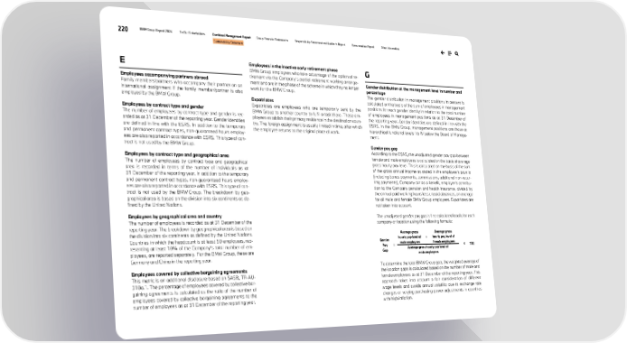 220 BMW Group Report 2024 To Our Stakeholders Combined Management Report Group Financial Statements Responsibility Statement and Auditor’s Report Remuneration Report Other Information Sustainability Statement E Employees accompanying partners abroad Family members/partners who accompany their partner on an international assignment if the family member/partner is also employed by the BMW Group. Employees by contract type and gender The number of employees by contract type and gender is rec- orded as at 31 December of the reporting year. Gender identities are defined in line with the ESRS. In addition to the temporary and permanent contract types, non-guaranteed hours employ- ees are also reported in accordance with ESRS. This type of con- tract is not used by the BMW Group. Employees by contract type and geographical area The number of employees by contract type and geographical area is recorded in terms of the number of individuals as at 31 December of the reporting year. In addition to the temporary and permanent contract types, non-guaranteed hours employ- ees are also reported in accordance with ESRS. This type of con- tract is not used by the BMW Group. The breakdown by geo- graphical area is based on the division into six continents as de- fined by the United Nations. Employees by geographical area and country The number of employees is recorded as at 31 December of the reporting year. The breakdown by geographical area is based on the division into six continents as defined by the United Nations. Countries in which the headcount is at least 50 employees, rep- resenting at least 10% of the Company’s total number of em- ployees, are reported separately. For the BMW Group, these are Germany and China in the reporting year. Employees covered by collective bargaining agreements This metric is an additional disclosure based on SASB, TR-AU- 310a.1. The percentage of employees covered by collective bar- gaining agreements is calculated as the ratio of the number of employees covered by collective bargaining agreements to the number of employees as at 31 December of the reporting year. Employees in the inactive early retirement phase BMW Group employees who take advantage of the option of re- tirement via the Company’s partial retirement working arrange- ment and are in the phase of the scheme in which they no longer work for the BMW Group. Expatriates Expatriates are employees who are temporarily sent by the BMW Group to another country to fulfil a task there. These em- ployees establish their primary residence in the destination coun- try. The foreign assignment is usually limited in time, after which the employee returns to the original place of work. G Gender distribution at the management level in number and percentage The gender distribution in management positions in percent is calculated on the basis of the sum of employees in management positions for each gender identity in relation to the total number of employees in management positions as at 31 December of the reporting year. Gender identities are defined in line with the ESRS. In the BMW Group, management positions are those at hierarchical functional levels I to IV below the Board of Manage- ment. Gender pay gap According to the ESRS, the unadjusted gender pay gap between female and male employees is calculated on the basis of average gross hourly pay level. This is calculated on the basis of the sum of the gross annual income as stated in the employee’s payslip (including bonus payments, commissions, additional non-recur- ring payments), Company car as a benefit, employer’s contribu- tion to the Company pension and health insurance, divided by the annual paid working hours less unpaid absences, on average for all male and female BMW Group employees. Expatriates are not taken into account. The unadjusted gender pay gap is first calculated locally for each company or location using the following formula: Gender Pay Gap = Average gross hourly pay level of male employees - Average gross hourly pay level of female employees × 100 Average gross hourly pay level of male employees To determine the total BMW Group gap, the weighted average of the location gaps is calculated based on the number of male and female employees as at 31 December of the reporting year. This approach takes into account a fair consideration of different wage levels and avoids annual volatility due to exchange rate changes or varying purchasing power adjustments in countries with high inflation.
