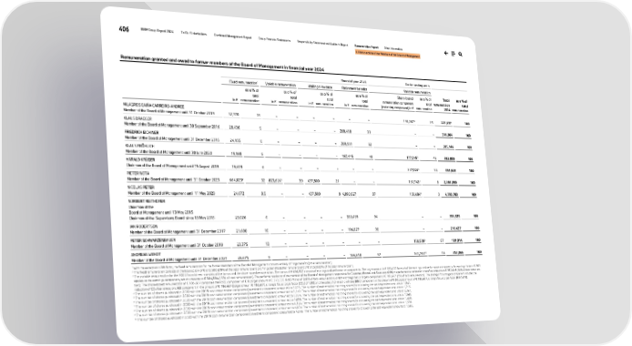 406 BMW Group Report 2024 To Our Stakeholders Combined Management Report Group Financial Statements Responsibility Statement and Auditor’s Report Remuneration Report Other Information II. Remuneration of the Members of the Board of Management Remuneration granted and owed to former members of the Board of Management in financial year 2024 Financial year 2024 Earlier vesting years Fixed remuneration1 Variable remuneration Waiting allowance Retirement benefits Variable remuneration in € as a % of total remuneration in € as a % of total remuneration in € as a % of total remuneration in € as a % of total remuneration Share-based remuneration component (matching component) in € as a % of total remuneration Total remuneration 2024 as a % of total remuneration MILAGROS CAIÑA CARREIRO-ANDREE Member of the Board of Management until 31 October 2019 32,370 15 – – – – – – 190,2674 85 222,637 100 KLAUS DRAEGER Member of the Board of Management until 30 September 2016 28,436 9 – – – – 288,468 91 – – 316,904 100 FRIEDRICH EICHINER Member of the Board of Management until 31 December 2016 24,155 8 – – – – 280,991 92 – – 305,146 100 KLAUS FRÖHLICH Member of the Board of Management until 30 June 2020 19,169 5 – – – – 187,445 49 177,2455 46 383,859 100 HARALD KRÜGER Chairman of the Board of Management until 15 August 2019 19,619 6 – – – – – – 337,0246 94 356,643 100 PIETER NOTA Member of the Board of Management until 31 October 2023 664,0232 32 823,6243 39 437,500 21 – – 161,7437 8 2,086,890 100 NICOLAS PETER Member of the Board of Management until 11 May 2023 24,672 0.5 – – 437,500 9 4,090,927 87 150,6848 3 4,703,783 100 NORBERT REITHOFER Chairman of the Board of Management until 13 May 2015 Chairman of the Supervisory Board since 13 May 2015 23,026 6 – – – – 333,499 94 – – 356,525 100 IAN ROBERTSON Member of the Board of Management until 31 December 2017 21,600 10 – – – – 196,827 90 – – 218,427 100 PETER SCHWARZENBAUER Member of the Board of Management until 31 October 2019 23,375 13 – – – – – – 158,5399 87 181,914 100 ANDREAS WENDT Member of the Board of Management until 31 December 2021 26,675 8 – – – – 164,648 47 161,74310 46 353,066 100 1 With the exception of Mr Nota, the fixed remuneration for the former members of the Board of Management consists entirely of fringe benefits (other remuneration). 2 The fixed remuneration consists of the base salary of € 612,500 (29% of the total remuneration) and fringe benefits (other remuneration) of € 51,523 (2% of the total remuneration). 3 The variable remuneration for the 2024 financial year consists of the bonus and the share-based remuneration. The bonus of € 636,957 consists of earnings and performance components. The target amount is € 335,417 for each of the earnings and performance components. An earnings factor of 0.909 applies to the earnings component, which amounts to € 304,894 (15% of total remuneration). The performance factor of the member of the Board of Management responsible for Customer, Brands and Sales was 0.99; the performance component therefore amounts to € 332,063 (16% of total remunera- tion). The share-based remuneration of € 186,667 comprises the RoCE component of € 0 (target amount of € 373,333, RoCE factor of 0; 0% of total remuneration) and the strategic focus targets component of € 186,667 (9% of total remuneration). The strategic focus targets component includes the reduction of CO2 fleet emissions EU component in the amount of € 186,667 (target amount € 186,667, strategic focus target factor (CO2) of 1.00) and the sales of all-electric vehicles (BEV) component in the amount of € 0 (target amount of € 186,667, strategic focus target factor (BEV) of 0). 4 The number of shares purchased in 2020 with the 2019 cash remuneration component (investment component) amounted to 5,525. The number of mathematical matching shares for calculating the cash equivalent amounts to 1,841. 5 The number of shares purchased in 2020 with the 2019 cash remuneration component (investment component) amounted to 5,147. The number of mathematical matching shares for calculating the cash equivalent amounts to 1,715. 6 The number of shares purchased in 2020 with the 2019 cash remuneration component (investment component) amounted to 9,784. The number of mathematical matching shares for calculating the cash equivalent amounts to 3,261. 7 The number of shares purchased in 2020 with the 2019 cash remuneration component (investment component) amounted to 4,696. The number of mathematical matching shares for calculating the cash equivalent amounts to 1,565. 8 The number of shares purchased in 2020 with the 2019 cash remuneration component (investment component) amounted to 4,374. The number of mathematical matching shares for calculating the cash equivalent amounts to 1,458. 9 The number of shares purchased in 2020 with the 2019 cash remuneration component (investment component) amounted to 4,604. The number of mathematical matching shares for calculating the cash equivalent amounts to 1,534. 10 The number of shares purchased in 2020 with the 2019 cash remuneration component (investment component) amounted to 4,696. The number of mathematical matching shares for calculating the cash equivalent amounts to 1,565.