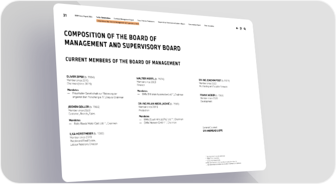 31 BMW Group Report 2024 To Our Stakeholders Combined Management Report Group Financial Statements Responsibility Statement and Auditor’s Report Remuneration Report Other Information Composition of the Board of Management and Supervisory Board CURRENT MEMBERS OF THE BOARD OF MANAGEMENT OLIVER ZIPSE (b. 1964) Member since 2015 Chairman (since 2019) Mandates — Fraunhofer-Gesellschaft zur Förderung der angewandten Forschung e. V.*, Deputy Chairman JOCHEN GOLLER (b. 1966) Member since 2023 Customer, Brands, Sales Mandates — Rolls-Royce Motor Cars Ltd.*,**, Chairman ILKA HORSTMEIER (b. 1969) Member since 2019 People and Real Estate, Labour Relations Director WALTER MERTL (b. 1974) Member since 2023 Finance Mandates — BMW Brilliance Automotive Ltd.*,**, Chairman DR-ING MILAN NEDELJKOVIĆ (b. 1969) Member since 2019 Production Mandates — BMW (South Africa) (Pty) Ltd.*,**, Chairman — BMW Motoren GmbH*,**, Chairman DR-ING JOACHIM POST (b. 1971) Member since 2022 Purchasing and Supplier Network FRANK WEBER (b. 1966) Member since 2020 Development General Counsel: DR ANDREAS LIEPE * Not listed on the stock exchange. * * BMW Group mandate. *** Group mandate (other). — Memberships on other mandatory supervisory boards. — Memberships on comparable boards in Germany and abroad. COMPOSITION OF THE BOARD OF MANAGEMENT AND SUPERVISORY BOARD