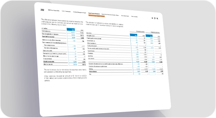 292 BMW Group Report 2024 To Our Stakeholders Combined Management Report Group Financial Statements Responsibility Statement and Auditor’s Report Remuneration Report Other Information Notes to the Group Financial Statements The difference between the expected tax expense based on the underlying tax rate for Germany and actual tax expense is ex- plained in the following reconciliation: in € million 2024 2023 Profit before tax 10,971 17,096 Tax rate applicable in Germany 30.8% 30.9% Expected tax expense 3,379 5,283 Variances due to different tax rates – 472 – 786 Tax increases (+) / tax reductions (-) due to: Tax-exempt income – 159 – 217 Non-deductible expenses 487 632 Equity accounted 4 44 Tax expense (+) / benefits (–) for prior years – 16 – 284 Effects from tax rate changes – 25 – 7 Other variances 95 266 Actual tax expense 3,293 4,931 Effective tax rate 30.0% 28.8% The tax increases due to non-deductible expenses were mainly attributable to withholding tax expenses. Other variances included an amount of € 106 million (2023: € 304 million) attributable to deferred tax effects relating to prior periods. The allocation of deferred tax assets and liabilities to balance sheet line items at 31 December is shown in the following table: Deferred tax assets Deferred tax liabilities in € million 2024 2023 2024 2023 Intangible assets 21 18 4,866 4,674 Property, plant and equipment 183 263 1,985 1,987 Leased products 405 394 2,622 2,895 Other investments 6 3 – – Sundry other assets 1,938 1,478 3,152 3,334 Tax loss carryforwards and unused tax credits 178 182 – – Capital losses 484 461 – – Provisions 5,090 5,012 9 19 Liabilities 4,584 4,575 836 1,027 Eliminations 4,348 4,162 2,463 2,332 17,237 16,548 15,933 16,268 Valuation allowances on tax loss carryforwards and temporary differences – 197 – 185 – – Valuation allowances on capital losses – 484 – 461 – – Netting – 13,312 – 13,471 – 13,312 – 13,471 Deferred taxes 3,244 2,431 2,621 2,797 Net 623 – – 366