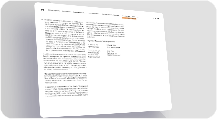 416 BMW Group Report 2024 To Our Stakeholders Combined Management Report Group Financial Statements Responsibility Statement and Auditor’s Report Remuneration Report Other Information VI. Outlook for the 2025 Financial Year — In addition to the existing requirements to hold shares as part of share-based remuneration, the Supervisory Board can oblige the members of the Board of Management to ac- quire and hold BMW shares of common stock by means of a share ownership guideline. The Supervisory Board has made use of this option for the members of the Board of Management currently in office and agreed on a corre- sponding contractual obligation. This stipulates that from the 2025 financial year onwards, members of the Board of Management will be obliged to invest 200% (Chairman of the Board of Management) or 100% (members of the Board of Management) of their base salary (gross) in BMW shares of common stock and to hold these until they step down from the Board of Management. This will strengthen the long-term business focus of the Board of Management. In addition to this amendment to the remuneration system for the Board of Management, the Supervisory Board has resolved for the first time in four years to increase target total remuneration moderately from the 2025 financial year onwards. The maxi- mum target achievement for the variable remuneration compo- nents continues to be limited to 180%. The maximum remuner- ation (overall caps within the meaning of § 87a (1) Sentence 2 No. 1 AktG) has not been increased. The Supervisory Board will submit the revised remuneration sys- tem for Board of Management remuneration to the 2025 Annual General Meeting for approval. It will be explained in detail on the Company website when the invitation to the Annual General Meeting is issued. In agreement with the members of the Board of Management currently in office, their service contracts were amended, subject to approval by the Annual General Meeting 2025, with effect from 1 January 2025, in order to implement the amendments to the remuneration system for financial years from 2025 onwards. The Supervisory Board has also reviewed the previous system of remuneration for members of the Supervisory Board and incor- porated the advice of an independent external remuneration consultant. This did not result in any amendments. The current rules for remuneration of members of the Supervisory Board pur- suant to § 16 of the Articles of Incorporation will therefore be submitted unchanged to the 2025 Annual General Meeting for confirmation. Bayerische Motoren Werke Aktiengesellschaft On behalf of the Supervisory Board On behalf of the Board of Management Dr.-Ing. Dr.-Ing. E.h. Norbert Reithofer Chairman of the Supervisory Board Oliver Zipse Chairman of the Board of Management