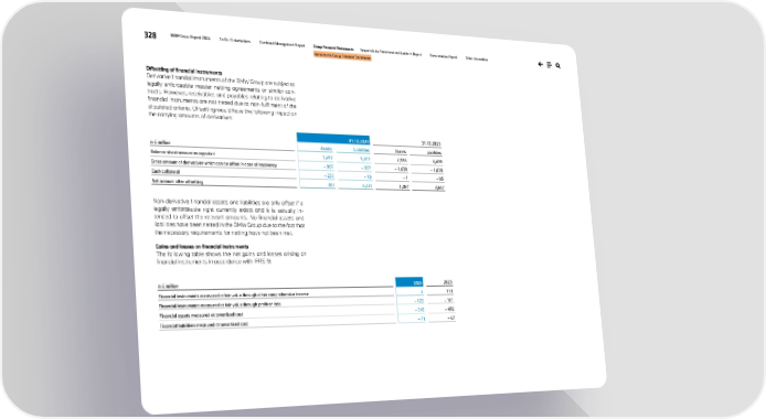 328 BMW Group Report 2024 To Our Stakeholders Combined Management Report Group Financial Statements Responsibility Statement and Auditor’s Report Remuneration Report Other Information Notes to the Group Financial Statements Offsetting of financial instruments Derivative financial instruments of the BMW Group are subject to legally enforceable master netting agreements or similar con- tracts. However, receivables and payables relating to derivative financial instruments are not netted due to non-fulfilment of the stipulated criteria. Offsetting would have the following impact on the carrying amounts of derivatives: 31.12.2024 31.12.2023 in € million Assets Liabilities Assets Liabilities Balance sheet amount as reported 1,497 5,207 2,926 4,400 Gross amount of derivatives which can be offset in case of insolvency – 957 – 957 – 1,638 – 1,638 Cash collateral – 233 – 19 – 1 – 95 Net amount after offsetting 307 4,231 1,287 2,667 Non-derivative financial assets and liabilities are only offset if a legally enforceable right currently exists and it is actually in- tended to offset the relevant amounts. No financial assets and liabilities have been netted in the BMW Group due to the fact that the necessary requirements for netting have not been met. Gains and losses on financial instruments The following table shows the net gains and losses arising on financial instruments in accordance with IFRS 9: in € million 2024 2023 Financial instruments measured at fair value through other comprehensive income 2 113 Financial instruments measured at fair value through profit or loss – 122 – 161 Financial assets measured at amortised cost – 349 – 482 Financial liabilities measured at amortised cost – 71 – 67