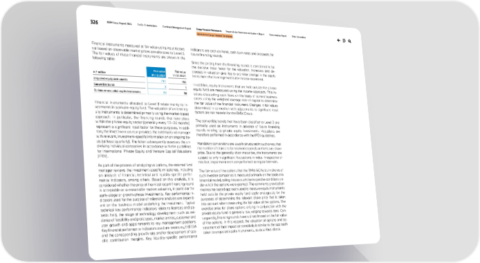 326 BMW Group Report 2024 To Our Stakeholders Combined Management Report Group Financial Statements Responsibility Statement and Auditor’s Report Remuneration Report Other Information Notes to the Group Financial Statements Financial instruments measured at fair value using input factors not based on observable market prices are allocated to Level 3. The fair values of these financial instruments are shown in the following table: in € million Fair value 31.12.2024 Fair value 31.12.2023 Unquoted equity instruments 711 765 Convertible bonds 3 1 Options on unquoted equity instruments 64 58 Financial instruments allocated to Level 3 relate mainly to in- vestments in a private-equity fund. The valuation of unlisted eq- uity instruments is determined primarily using the market-based approach. In particular, the financing rounds that take place within the private equity sector (generally every 12–24 months) represent a significant input factor for these purposes. In addi- tion, the investment advisor provides the external fund manager with relevant, investment-specific information on an ongoing ba- sis (at least quarterly). The latter subsequently assesses the un- derlying individual companies in accordance with the guidelines for International Private Equity and Venture Capital Valuations (IPEV). As part of the process of analysing valuations, the external fund manager reviews the investment-specific milestones, including an analysis of financial, technical and liquidity-specific perfor- mance indicators, among others. Based on this analysis, it is considered whether the price of the most recent financing round is acceptable as a reasonable market valuation, in particular for early-stage or growth-phase investments. Key performance in- dicators used for the purpose of milestone analysis are depend- ent on the business model underlying the investment. Typical technical key performance indicators relate to licenses and pa- tents held, the stage of technology development such as evi- dence of feasibility and prototypes, market entries, customer and user growth and appointments to key management positions. Key financial performance indicators used are revenues, EBITDA and the corresponding growth rate and/or development of spe- cific contribution margins. Key liquidity-specific performance indicators are cash on hand, cash burn rates and prospects for future financing rounds. Since the pricing from the financing rounds is considered to be the decisive input factor for the valuation, increases and de- creases in valuation give rise to a similar change in the equity instrument that is recognised in the income statement. In addition, equity instruments that are held outside the private equity fund are measured using the income approach. This in- volves discounting cash flows on the basis of current business cases using the weighted average cost of capital to determine the fair value of the financial instrument. Changes in fair values determined in connection with adjustments to significant input factors are not material for the BMW Group. The convertible bonds that have been classified to Level 3 are primarily used as instruments in advance of future financing rounds relating to private equity investments. Valuations are therefore performed in accordance with the IPEV guidelines. Mandatory conversions are usually structured in such a way that the number of shares to be received depends on the future share price. Due to the generally short maturities, the instruments are subject to only insignificant fluctuations in value. Irrespective of this fact, impairment tests are performed at regular intervals. The fair value of the options that the BMW AG holds in shares of such investee companies is measured primarily on the basis of a binomial model, taking into account the respective conditions un- der which the options were granted. The comments provided on the income-based approach used to measure equity instruments held outside the private equity fund apply analogously for the purposes of determining the relevant share price that is taken into account when measuring the fair value of the options. The exercise price for share options arising in conjunction with the private equity fund is generally low, verging towards zero. Con- sequently, financing rounds have a direct impact on the fair value of the options. In this respect, the valuation of options and as- sessment of their impact on sensitivity is similar to the approach taken to unquoted equity instruments, as described above.