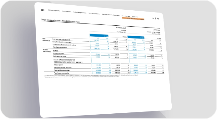 383 BMW Group Report 2024 To Our Stakeholders Combined Management Report Group Financial Statements Responsibility Statement and Auditor’s Report Remuneration Report Other Information II. Remuneration of the Members of the Board of Management Target remuneration for the 2024 (2023) financial year MILAN NEDELJKOVIĆ JOACHIM POST Production since 1 October 2019 Purchasing and Supplier Network since 1 January 2022 FY 2024 FY 2023 FY 2024 FY 2023 in € in % in € in % in € in % in € in % Fixed remuneration Fixed remuneration (base salary) 1,050,000 27 1,050,000 27 900,000 27 900,000 27 Fringe benefits (other remuneration)1 32,312 1 27,524 1 29,124 1 22,692 1 Contribution to the company pension scheme 400,000 10 400,000 10 400,000 12 400,000 12 Total fixed remuneration 1,482,312 38 1,477,524 38 1,329,124 39 1,322,692 39 Variable remuneration B O N U S Earnings component 575,000 15 575,000 15 475,000 14 475,000 14 Performance component 575,000 15 575,000 15 475,000 14 475,000 14 S H A R E - B A S E D R E M U N E R A T I O N ( P E R S O N A L C A S H I N V E S T M E N T A M O U N T ) ² RoCE component 640,000 16 640,000 16 550,000 16 550,000 16 Strategic focus target component 640,000 16 640,000 16 550,000 16 550,000 16 Total variable remuneration 2,430,000 62 2,430,000 62 2,050,000 61 2,050,000 61 Total target remuneration 3,912,312 100 3,907,524 100 3,379,124 100 3,372,692 100 1 For more information about fringe benefits for the 2023 and 2024 financial years, refer to ↗ Remuneration granted and owed to members of the Board of Management pursuant to § 162 of the German Stock Corporation Act (AktG). 2 Assessment period five years in total: one year for determining the personal cash investment amount, a four-year holding obligation for the shares acquired with the payout amount.