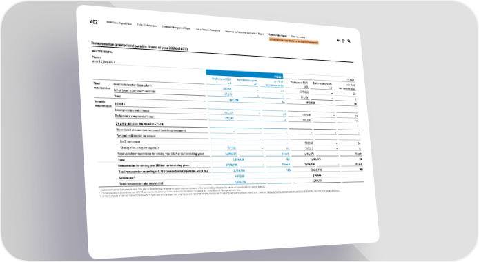 402 BMW Group Report 2024 To Our Stakeholders Combined Management Report Group Financial Statements Responsibility Statement and Auditor’s Report Remuneration Report Other Information II. Remuneration of the Members of the Board of Management Remuneration granted and owed in financial year 2024 (2023) WALTER MERTL Finance since 12 May 2023 FY 2024 FY 2023 Vesting year 2024 in € Earlier vesting years in € as a % of total remuneration Vesting year 2023 in € Earlier vesting years in € as a % of total remuneration Fixed remuneration Fixed remuneration (base salary) 900,000 – 41 570,652 – 23 Fringe benefits (other remuneration) 27,273 – 1 111,981 – 5 Total 927,273 42 682,633 28 Variable remuneration B O N U S Earnings component of bonus 431,775 – 20 505,978 – 21 Performance component of bonus 470,250 – 22 307,201 – 13 S H A R E - B A S E D R E M U N E R A T I O N Share-based remuneration component (matching component) – – – – – – Personal cash investment amount1 RoCE component – – – 582,382 – 24 Strategic focus target component 357,500 – 16 367,912 – 15 Total variable remuneration for vesting year 2024 or earlier vesting years 1,259,525 – 58 or 0 1,763,473 – 72 or 0 Total 1,259,525 58 1,763,473 72 Remuneration for vesting year 2024 or earlier vesting years 2,186,798 – 100 or 0 2,446,106 – 100 or 0 Total remuneration according to § 162 German Stock Corporation Act (AktG) 2,186,798 100 2,446,106 100 Service cost2 407,218 254,444 Total remuneration plus service cost3 2,594,016 2,700,550 1 Assessment period five years in total: One year for determining the personal cash investment amount, a four-year holding obligation for the shares acquired with the payout amount. 2 The service cost in accordance with IAS 19 represents the expense for the company; this amount is not paid out to the Board of Management member. 3 For the purposes of compliance with the maximum specified remuneration limit, only the service cost and the remuneration for the vesting year are to be taken into account. See table ↗ Maximum remuneration and remuneration vested in the 2024 financial year (vesting year).