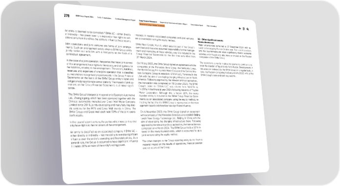 278 BMW Group Report 2024 To Our Stakeholders Combined Management Report Group Financial Statements Responsibility Statement and Auditor’s Report Remuneration Report Other Information Notes to the Group Financial Statements An entity is deemed to be controlled if BMW AG – either directly or indirectly – has power over it, is exposed or has rights to vari- able returns from it and has the ability to influence those returns. Joint operations and joint ventures are forms of joint arrange- ments. Such an arrangement exists when a BMW Group entity jointly carries out activities with a third party on the basis of a contractual agreement. In the case of a joint operation, the parties that have joint control of the arrangement have rights to the assets, and obligations for the liabilities, relating to the arrangement. The assets, liabilities, revenues and expenses of one joint operation that is classified as material are recognised proportionately in the Group Financial Statements on the basis of the BMW Group entity’s rights and obligations (proportionate consolidation). The impact of joint op- erations on the Group Financial Statements is of minor signifi- cance. The BMW Group's largest joint operation is Spotlight Automotive Ltd., Zhangjiagang, which has been operated together with the Chinese automobile manufacturer Great Wall Motor Company Limited since 2019, jointly developing and manufacturing elec- tric vehicles for the MINI and Great Wall brands in China. The BMW Group and Great Wall each hold 50% of the joint opera- tion’s equity. In the case of a joint venture, the parties which have joint control only have rights to the net assets of the arrangement. An entity is classified as an associated company if BMW AG – either directly or indirectly – has the ability to exercise significant influence over the entity’s operating and financial policies. As a general rule, the Group is assumed to have significant influence if it holds 20% or more of the entity’s voting power. Interests in material associated companies and joint ventures are accounted for using the equity method. BMW Fleet GmbH, Munich, which acquired part of the Group's own fleet and thus also assumed responsibility for the manage- ment and marketing of these vehicles, was fully included in the Group Financial Statements for the first time with effect from 31 March 2024. On 19 July 2023, the BMW Group signed an agreement with the companies of the Mercedes-Benz Group, the Stellantis Group, the Honda Group, the Hyundai Motor Group and the General Mo- tors Company Group to establish IONNA LLC, Torrance, in the USA with the aim of developing charging infrastructure in North America. Following approval by the relevant antitrust authorities, the transaction was completed on 18 October 2023. The BMW Group's stake in IONNA LLC was diluted from 16.67% to 14.29% in the financial year 2024 following the entry of Toyota Motor Corporation. Although this is below 20%, the newly founded entity is included in the BMW Group Financial State- ments as an associated company using the equity method, re- flecting the fact that the BMW Group is represented on the man- agement board and therefore has significant influence. On 6 November 2023, the BMW Group signed an agreement with a company of the Mercedes-Benz Group to establish Beijing Ionchi New Energy Technology Ltd., Beijing, in China with the aim of developing the charging infrastructure there. Following approval by the relevant antitrust authorities, the transaction was completed on 4 March 2024. The BMW Group holds a 50% in- terest in the newly founded entity, which is accounted for as a joint venture using the equity method. The other changes to the Group reporting entity do not have a material impact on the results of operations, financial position and net assets of the Group. 03 Other significant events Russia-Ukraine war Major uncertainties remained at 31 December 2024 with re- spect to the ongoing Russia-Ukraine war. The current sanctions and the countermeasures taken significantly restrict economic activities with Russia and also have an impact on the Russian companies of the BMW Group. The restrictions currently in place for payments continue to re- strict the transfer of liquid funds from Russia. Developments in this area are reviewed by the BMW Group on a regular basis. In total, the Russian companies hold around 4% (2023: 4%) of the BMW Group's cash and cash equivalents.