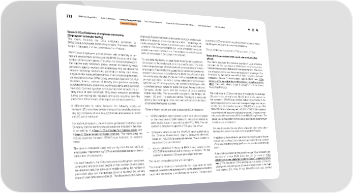 213 BMW Group Report 2024 To Our Stakeholders Combined Management Report Group Financial Statements Responsibility Statement and Auditor’s Report Remuneration Report Other Information Sustainability Statement Scope 3: CO2e Emissions of employee commuting [Employees’ commuter traffic] The metric includes the CO2e emissions generated by BMW Group employees commuting to work. The metric reflects Scope 3 Category 7 of the Greenhouse Gas Protocol. BMW Group employees are all persons with temporary or per- manent employment contracts at the BMW Group as at 31 De- cember of the reporting year. This does not include employees in the inactive early retirement phase, women on maternity leave, temporary agency workers and employees who are absent for reasons including sabbaticals, parental or family care leave, long-term sick leave, military service, or accompanying their part- ner abroad and other BMW Group employees (apprentices, dual students, interns, authors of theses, post-graduate students, scholarship holders, assistants, working students and (journalist) trainees). Commuting refers to the journey from home to the pri- mary place of work and back. Only direct emissions generated during commuting are included; emissions resulting from the production of the means of transport are not accounted for. A differentiation is made between the following modes of transport: (1) motorised private transport (automobile, motorcy- cle), (2) Company shuttle bus, (3) bicycle and pedestrian traffic and (4) public transport. For technical reasons, the emissions generated from the use of Company cars for commuting purposes are included in this met- ric as well as in ↗ Scope 1: CO2e emissions from Company vehicles and ↗ Scope 2: CO2e emissions from Company vehicles. The metric does not include journeys between BMW Group locations or business travel. The data is calculated using real activity data for over 85% of employees. The remaining 15% is extrapolated based on the to- tal number of employees. For each location, the CO2e emissions resulting from employee commuting are calculated based on the number of employees, the absence rate, the take-up of mobile working, the number of production days and the average distance between the primary place of work and home address. The distance is calculated per employee. Residential location data at the postcode level is avail- able and is taken as a basis for the calculation. The average per capita values for the respective sites are used in subsequent cal- culations. The average distance per mode of transport was cal- culated separately for each site. The distance travelled by Com- pany shuttle buses is calculated in kilometres. To calculate the metric, a usage factor is attributed to each car- rier, known as the modal split, on a site-specific basis. This indi- cates the percentage of employees who use a particular means of transport. The data for the usage factor is collected by external providers via surveys or provided by the BMW Group’s plants and non-manufacturing sites (in-house mobility departments) based on their own data. The data is further validated by comparing it with the use of parking spaces, the number of employees with subsidised season tickets for public transport, the registration of Company shuttle buses and the number of bicycle parking spaces available. The automobile occupancy rate ranges be- tween 1.05 and 1.1 people per vehicle. The figure is measured directly (by counting) at some sites and estimated on the basis of comparative figures at others. Three different values are used to calculate CO2e emissions: — VDA’s emissions factors (most current valid version) based on the most recent GWP values for emissions related to work shuttle buses in accordance with IPCC AR6. The cal- culation is based on kilograms of CO2e per litre of fuel — Emissions factors as per the TREMOD report published by the German Environment Agency (Umweltbundesamt), based on IPCC AR5 for personal vehicles. The calculation is based on CO2e per kilometre — Values calculated in-house at BMW Group based on the VDV 2019 statistics on public transport emissions. The cal- culation is based on CO2e per passenger kilometre The values are applied globally for all regions. The kilometre distance is multiplied by the usage factor for each mode of transport and subsequently by the allocated emissions factor and the number of employees per location. The sum adds up to the total CO2e emissions resulting from employee commut- ing. Biogenic emissions are reported separately. The unit of the metric is tonnes of CO2 equivalent [t CO2e]. Scope 3: CO2e emissions from use of sold products [Use phase] The metric describes the absolute quantity of CO2e emissions calculated for the use phase of BMW Group vehicles (automo- biles and motorcycles) delivered in the reporting year. The abso- lute emissions in the use phase are based on the average CO2e emissions by the global new vehicle fleet, including upstream emissions (Scope 3 downstream, well-to-wheel, see ↗ CO2e emissions of the new vehicle fleet worldwide (Scope 3 downstream, well-to- wheel). The metric reflects Scope 3 Category 11 of the Green- house Gas Protocol. The total value in t CO2e is the result of multiplying the average CO2e emissions per km for the EU, US and Chinese markets by the number of BMW Group vehicles delivered worldwide in the reporting period and an assumed average mileage over the en- tire life cycle (Automotive segment: 200,000 km, as per VDA 900-100; Motorcycles segment: 40,000 - 100,000 km depend- ing on the model, based on statistical analyses). These core mar- kets account for more than 80% of the BMW Group’s sales. The actual values may differ from the calculated values depending on individual use and location. This metric records the use phase emissions of all units sold in the reporting period over their entire expected life cycle. In addition to the emissions generated during the use of the 