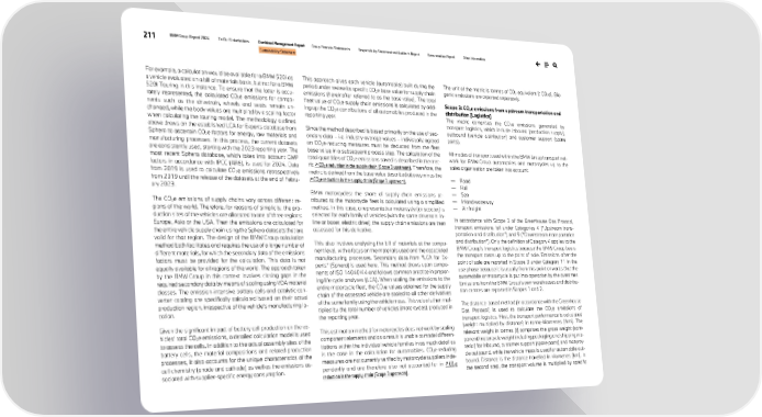 211 BMW Group Report 2024 To Our Stakeholders Combined Management Report Group Financial Statements Responsibility Statement and Auditor’s Report Remuneration Report Other Information Sustainability Statement For example, a calculation would be available for a BMW 520i as a vehicle evaluated on a bill of materials basis, but not for a BMW 520i Touring in this instance. To ensure that the latter is accu- rately represented, the calculated CO2e emissions for compo- nents such as the drivetrain, wheels and seats remain un- changed, while the body values are multiplied by a scaling factor when calculating the touring model. The methodology outlined above draws on the established LCA for Experts database from Sphera to ascertain CO2e factors for energy, raw materials and manufacturing processes. In this process, the current datasets are consistently used, starting with the 2023 reporting year. The most recent Sphera database, which takes into account GWP factors in accordance with IPCC (AR6), is used for 2024. Data from 2019 is used to calculate CO2e emissions retrospectively from 2019 until the release of the datasets at the end of Febru- ary 2023. The CO2e emissions of supply chains vary across different re- gions of the world. Therefore, for reasons of simplicity, the pro- duction sites of the vehicles are allocated to one of three regions: Europe, Asia or the USA. Then the emissions are calculated for the entire vehicle supply chain using the Sphera datasets that are valid for that region. The design of the BMW Group calculation method both facilitates and requires the use of a large number of different materials, for which the secondary data of the emissions factors must be provided for the calculation. This data is not equally available for all regions of the world. The approach taken by the BMW Group in this context involves closing gaps in the required secondary data by means of scaling using VDA material classes. The emission-intensive battery cells and catalytic con- verter coating are specifically calculated based on their actual production region, irrespective of the vehicle’s manufacturing lo- cation. Given the significant impact of battery cell production on the ve- hicles’ total CO2e emissions, a detailed calculation model is used to assess the cells. In addition to the actual assembly sites of the battery cells, the material compositions and related production processes, it also accounts for the unique characteristics of the cell chemistry (anode and cathode) as well as the emissions as- sociated with supplier-specific energy consumption. This approach gives each vehicle (automobile) built during the period under review its specific CO2e base value for supply chain emissions (hereinafter referred to as the base value). The total fleet value of CO2e supply chain emissions is calculated by add- ing up the CO2e contributions of all automobiles produced in the reporting year. Since the method described is based primarily on the use of sec- ondary data – i.e. industry average values – individually agreed on CO2e-reducing measures must be deducted from the fleet base value in a subsequent process step. The calculation of the total quantities of CO2e emissions saved is described in the met- ric ↗ CO2e reduction in the supply chain (Scope 3 upstream). Therefore, the metric is derived from the base value described above, minus the ↗ CO2e reduction in the supply chain (Scope 3 upstream). BMW motorcycles: the share of supply chain emissions at- tributed to the motorcycle fleet is calculated using a simplified method. In this case, a representative motorcycle (or scooter) is selected for each family of vehicles (with the same drivetrain: in- line or boxer, electric drive); the supply chain emissions are then assessed for this derivative. This also involves analysing the bill of materials at the compo- nent level, with a focus on the materials used and the associated manufacturing processes. Secondary data from “LCA for Ex- perts” (Sphera) is used here. This method draws upon compo- nents of ISO 14040/44 and follows common practice in prepar- ing life cycle analyses (LCA). When scaling the emissions to the entire motorcycle fleet, the CO2e values obtained for the supply chain of the assessed vehicle are scaled to all other derivatives of the same family using the vehicle mass. This value is then mul- tiplied by the total number of vehicles (motorcycles) produced in the reporting year. This estimation method for motorcycles does not work by scaling component elements and as a result is unable to model differen- tiations within the individual vehicle families in as much detail as is the case in the calculation for automobiles. CO2e-reducing measures are not currently verified by motorcycle suppliers inde- pendently and are therefore also not accounted for in ↗ CO2e reduction in the supply chain (Scope 3 upstream). The unit of the metric is tonnes of CO2 equivalent [t CO2e]. Bio- genic emissions are reported separately. Scope 3: CO2e emissions from upstream transportation and distribution [Logistics] The metric comprises the CO2e emissions generated by transport logistics, which include inbound (production supply), outbound (vehicle distribution) and customer support (spare parts). All modes of transport used within the BMW Group transport net- work for BMW Group automobiles and motorcycles up to the sales organisation are taken into account: — Road — Rail — Sea — Inland waterway — Air freight In accordance with Scope 3 of the Greenhouse Gas Protocol, transport emissions fall under Categories 4 (“Upstream trans- portation and distribution”) and 9 (“Downstream transportation and distribution”). Only the definition of Category 4 applies to the BMW Group’s transport logistics because the BMW Group bears the transport costs up to the point of sale. Emissions after the point of sale are reported in Scope 3 under Category 11 in the use phase because it is usu