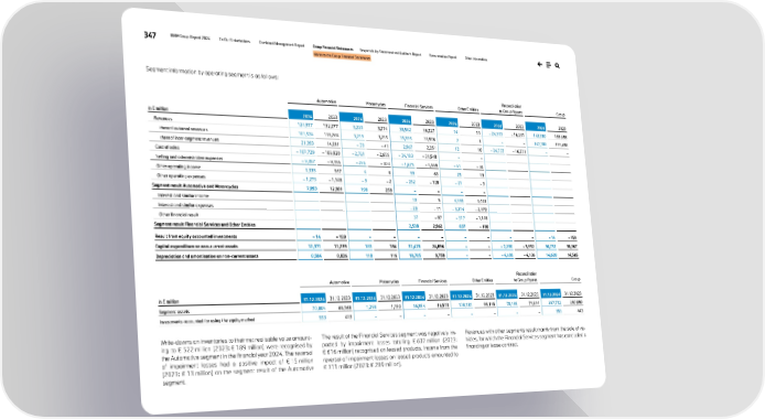 347 BMW Group Report 2024 To Our Stakeholders Combined Management Report Group Financial Statements Responsibility Statement and Auditor’s Report Remuneration Report Other Information Notes to the Group Financial Statements Segment information by operating segment is as follows: Automotive Motorcycles Financial Services Other Entities Reconciliation to Group figures Group in € million 2024 2023 2024 2023 2024 2023 2024 2023 2024 2023 2024 2023 Revenues 124,917 132,277 3,220 3,214 38,562 36,227 14 11 – 24,333 – 16,231 142,380 155,498 thereof external revenues 103,524 118,266 3,259 3,255 35,595 33,976 2 1 – – 142,380 155,498 thereof inter-segment revenues 21,393 14,011 – 39 – 41 2,967 2,251 12 10 – 24,333 – 16,231 – – Cost of sales – 107,729 – 109,920 – 2,721 – 2,656 – 34,183 – 31,548 – – Selling and administrative expenses – 9,357 – 9,195 – 296 – 303 – 1,675 – 1,559 – 41 – 34 Other operating income 1,335 967 4 6 59 63 23 13 Other operating expenses – 1,273 – 1,148 – 9 – 2 – 252 – 128 – 21 – 3 Segment result Automotive and Motorcycles 7,893 12,981 198 259 – – – – Interest and similar income 10 5 4,593 3,403 Interest and similar expenses – 20 – 11 – 3,214 – 2,372 Other financial result 37 – 87 – 517 – 1,118 Segment result Financial Services and Other Entities 2,538 2,962 837 – 100 Result from equity accounted investments – 14 – 159 – – – – – – – – – 14 – 159 Capital expenditure on non-current assets 12,371 11,239 183 184 31,478 24,896 – – – 7,280 – 5,952 36,752 30,367 Depreciation and amortisation on non-current assets 8,504 8,826 118 116 10,705 9,759 – – – 4,699 – 4,136 14,628 14,565 Automotive Motorcycles Financial Services Other Entities Reconciliation to Group figures Group in € million 31.12.2024 31.12.2023 31.12.2024 31.12.2023 31.12.2024 31.12.2023 31.12.2024 31.12.2023 31.12.2024 31.12.2023 31.12.2024 31.12.2023 Segment assets 70,804 66,168 1,298 1,190 16,954 16,573 108,181 95,145 70,495 71,814 267,732 250,890 Investments accounted for using the equity method 553 443 – – – – – – – – 553 443 Write-downs on inventories to their net realisable value amount- ing to € 522 million (2023: € 189 million) were recognised by the Automotive segment in the financial year 2024. The reversal of impairment losses had a positive impact of € 15 million (2023: € 13 million) on the segment result of the Automotive segment. The result of the Financial Services segment was negatively im- pacted by impairment losses totalling € 607 million (2023: € 616 million) recognised on leased products. Income from the reversal of impairment losses on leased products amounted to € 311 million (2023: € 289 million). Revenues with other segments result mainly from the sale of ve- hicles, for which the Financial Services segment has concluded a financing or lease contract.