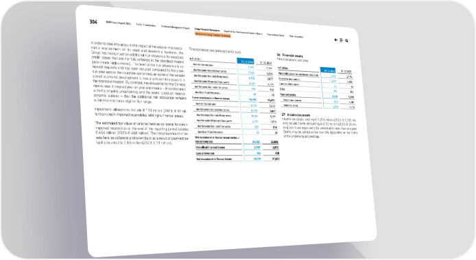 304 BMW Group Report 2024 To Our Stakeholders Combined Management Report Group Financial Statements Responsibility Statement and Auditor’s Report Remuneration Report Other Information Notes to the Group Financial Statements In order to take into account the impact of the weaker macroeco- nomic environment on its retail and dealership business, the Group has recognised an additional risk allowance for expected credit losses that are not fully reflected in the standard models (post-model adjustments). The level of the risk allowance is re- viewed regularly and has been reduced compared to the previ- ous year across the countries concerned, as some of the weaker overall economic development is now also taken into account in the standard models. By contrast, the allowance for the Chinese market was increased year on year and means – in combination with the ongoing uncertainties and the overall subdued macroe- conomic outlook – that the additional risk allowance remains within the mid-three-digit million range. Impairment allowances include € 133 million (2023: € 95 mil- lion) on credit-impaired receivables relating to finance leases. The estimated fair value of vehicles held as collateral for credit- impaired receivables at the end of the reporting period totalled € 656 million (2023: € 488 million). The carrying amount of as- sets held as collateral and taken back as a result of payment de- fault amounted to € 83 million (2023: € 19 million). Finance leases are analysed as follows: in € million 31.12.2024 31.12.2023 due within one year 7,579 7,107 due between one and two years 7,168 6,560 due between two and three years 6,152 5,677 due between three and four years 4,987 4,134 due between four and five years 938 942 due later than five years 36 32 Gross investment in finance leases 26,860 24,452 due within one year 6,546 6,232 due between one and two years 6,376 5,857 due between two and three years 5,604 5,191 due between three and four years 4,670 3,935 due between four and five years 835 836 due later than five years 32 29 Net investment in finance leases without loss allowances 24,063 22,080 Unrealised interest income 2,797 2,372 Loss allowances 466 458 Net investment in finance leases 23,597 21,622 26 Financial assets Financial assets comprise: in € million 31.12.2024 31.12.2023 Marketable securities and investment funds 1,470 2,170 Derivative instruments 1,497 2,926 Loans to third parties 22 18 Other 410 404 Financial assets 3,399 5,518 thereof non-current 834 1,387 thereof current 2,565 4,131 27 Income tax assets Income tax assets totalling € 1,316 million (2023: € 1,199 mil- lion) include claims amounting to € 26 million (2023: € 29 mil- lion), which are expected to be settled after more than one year. Claims may be settled earlier than this depending on the timing of the underlying proceedings.