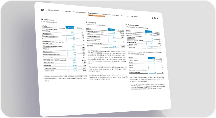 305 BMW Group Report 2024 To Our Stakeholders Combined Management Report Group Financial Statements Responsibility Statement and Auditor’s Report Remuneration Report Other Information Notes to the Group Financial Statements 28 Other assets Other assets comprise: in € million 31.12.2024 31.12.2023 Return right assets for future leased products 2,000 2,263 Collateral assets 892 455 Receivables from subsidiaries 684 642 Deposits 98 98 Receivables from companies in which an investment is held 55 48 Other assets (financial instruments) 3,729 3,506 Other taxes 1,686 1,987 Advance payments 1,168 847 Expected reimbursement claims 818 819 Prepaid expenses 555 517 Other assets (non-financial instruments) 4,227 4,170 Sundry other assets 1,300 1,457 Other assets 9,256 9,133 thereof non-current 1,827 1,537 thereof current 7,429 7,596 Collateral assets comprise mainly customary collateral (banking deposits) arising on the sale of asset-backed financing instru- ments. 29 Inventories Inventories comprise the following: in € million 31.12.2024 31.12.2023 Finished goods and goods for resale 16,851 16,103 Work in progress, unbilled contracts 3,130 3,190 Raw materials and supplies 3,310 3,722 Vehicles held for sale in the financial services business 1,096 693 Advance payments to suppliers – 11 Inventories 24,387 23,719 Out of the total amount recognised for inventories at 31 Decem- ber 2024, inventories measured at net realisable value amounted to € 2,537 million (2023: € 1,346 million). Write- downs to net realisable value in the financial year 2024 amounted to € 522 million (2023: € 189 million), while rever- sals of write-downs amounted to € 15 million (2023: € 13 mil- lion). The expense recorded in conjunction with inventories during the financial year 2024 amounted to € 75,333 million (2023: € 81,497 million). At 31 December 2024, the carrying amounts of inventories ex- pected to be realised after more than twelve months amount to € 54 million (2023: € 86 million). 30 Trade receivables Trade receivables comprise the following: in € million 31.12.2024 31.12.2023 Gross carrying amount 2,917 4,232 Allowances for impairment of Stage 2 – simplified approach – 11 – 18 Allowances for impairment of Stage 3 – 72 – 52 Net carrying amount 2,834 4,162 thereof non-current 3 3 thereof current 2,831 4,159 Impairment allowances on trade receivables in accordance with IFRS 9 developed as follows: in € million 2024 2023 Balance at 1 January 70 59 Allocated 22 17 Reversed – 6 – 2 Utilised – 3 – 3 Exchange rate impact and other changes – – 1 Balance at 31 December 83 70 In the case of trade receivables, collateral is generally held in the form of vehicle documents and bank guarantees so that the risk of bad debt loss is very limited. Expenses for impairment losses and income from the reversal of impairment losses are not significant for the BMW Group and are therefore not reported separately in the income statement.