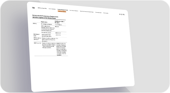 194 BMW Group Report 2024 To Our Stakeholders Combined Management Report Group Financial Statements Responsibility Statement and Auditor’s Report Remuneration Report Other Information Sustainability Statement Entries in the EU Transparency Register and in equivalent registers of the Member States Register name Identification number in the register BMW AG EU Transparency Register 7193977808-18 Lobby register for the representation of interests vis-à- vis the German Bundestag and the Federal Government R002370 Bavarian lobby register DEBYLT007F BMW Motoren GmbH Lobbying and interest representation register LIVR-01130 BMW Automotive (Ireland) Ltd. Register of Lobbying maintained by the Standards in Public Office Commission 1373 BMW France S.A. Register of Lobbying maintained by HAUTE AUTORITÉ POUR LA TRANSPARENCE DE LA VIE PUBLIQUE (HATVP) 5HABRCXV, ZV92LP1H, YVIKRQAH, PVXASO43, UVPUF1GH, GVTU7903, EVJFE0PH, LV1DGNI3, BHOB62A3, 0VE7PMF3, Y3GQAMLH, DHMZCMYV, Y3KG6M5V, 0V2ARJJV, LV1C6E0V, C34BL90V, Q36SB5KV