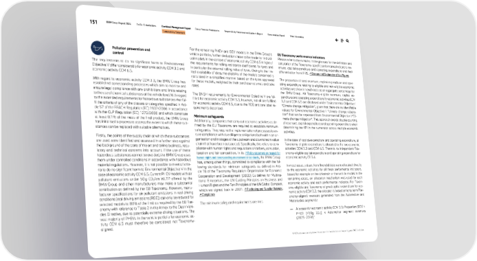 151 BMW Group Report 2024 To Our Stakeholders Combined Management Report Group Financial Statements Responsibility Statement and Auditor’s Report Remuneration Report Other Information Sustainability Statement Pollution prevention and control The requirements to do no significant harm to Environmental Objective V differ considerably for economic activity CCM 3.3 and economic activity CCM 6.5. With regard to economic activity CCM 3.3, the BMW Group has established corresponding processes which aim to monitor and ensure legal compliance with any prohibitions and limits relating to the use of chemical substances at the vehicle level. With regard to the extended requirements for hazardous substances that ful- fil the criteria of any of the classes or categories specified in Arti- cle 57 of the REACH Regulation (EC) 1907/2006 in accordance with the CLP Regulation (EC) 1272/2008 and which constitute at least 0.1% of the mass of the final product, the BMW Group has initialised a process to assess the extent to which these sub- stances can be replaced with suitable alternatives. Firstly, the points of the supply chain at which these substances are used were identified and assessed in a further step against the background of the state of the art and taking business, regu- latory and technical concerns into account. If the use of these hazardous substances cannot be avoided, the BMW Group uses them under controlled conditions in accordance with hazardous material regulations. However, it is not possible to meet all crite- ria to do no significant harm to Environmental Objective V in the case of economic activity CCM 6.5. Current PHEV models with air pollutant emissions under 50 g CO2/km WLTP offered by the BMW Group and other manufacturers may make a substantial contribution as defined by the EU Taxonomy. However, manu- facturer specifications for air pollutant emissions in real driving conditions (real driving emissions [RDE]) can only be reduced for selected models to 80% of the limit as required by the EU Tax- onomy with reference to Table 2 in the Annex to the Clean Vehi- cles Directive, due to potentially extreme driving situations. The vast majority of PHEVs in the vehicle portfolio for economic ac- tivity CCM 6.5 must therefore be considered not Taxonomy- aligned. For the remaining PHEV and BEV models in the BMW Group’s vehicle portfolio, further deductions have to be made for individ- ual models in the context of economic activity CCM 6.5 in light of the requirements for rolling resistance coefficients for tyres and in particular the external rolling noise of tyres. Owing to the lim- ited availability of data, the eligibility of the models concerned is calculated in a simplified manner based on the tyres approved for these models, weighted by their purchase volumes and take rates. The DNSH requirements for Environmental Objective V are ful- filled for economic activity CCM 3.3; however, not all are fulfilled for economic activity CCM 6.5, due to the RDE and tyre label re- quirements described. Minimum safeguards Additionally, companies that carry out economic activities as de- fined by the EU Taxonomy are required to establish minimum safeguards. They require the implementation of processes to en- sure compliance with due diligence obligations both within an or- ganisation and in stages of the upstream and downstream value chain that have been outsourced. Specifically, this refers to com- pliance with human rights and regulations on bribery, corruption, taxation and fair competition. In its ↗ Policy statement on respect for human rights and corresponding environmental standards, the BMW Group has, among other things, committed to compliance with the fol- lowing standards for minimum safeguards as defined in Arti- cle 18 of the Taxonomy Regulation: Organization for Economic Cooperation and Development (OECD) Guidelines for Multina- tional Enterprises, the UN Guiding Principles on Business and Human Rights and the Ten Principles of the UN Global Compact, which we signed back in 2001. ↗ Purchasing and Supplier Network, ↗ Compliance The minimum safeguard requirements are met. EU Taxonomy performance indicators Please refer to the remarks in the glossary for the definition and calculation of the Taxonomy-specific performance indicators rev- enues, capital expenditure and operating expenditure and their differentiation from IFRS. ↗ Glossary and Explanation of Key Figures The proportion of total revenues, capital expenditure and oper- ating expenditure relating to eligible and non-eligible economic activities are shown in each case as an aggregate percentage for the BMW Group. All Taxonomy-eligible revenues, capital ex- penditure and operating expenditure for economic activities CCM 3.3 and CCM 6.5 are disclosed under Environmental Objective I “Climate change mitigation”, given that there are no identifiable values for Environmental Objective II “climate change adapta- tion” that can be separated from Environmental Objective I “Cli- mate change mitigation”. This approach avoids double counting of revenues, capital expenditure and operating expenditure when determining the KPI in the numerator across multiple economic activities. In the case of capital expenditure and operating expenditure, all Taxonomy-eligible expenditure is allocated to the two economic activities CCM 3.3 and CCM 6.5. There is no independent Tax- onomy-eligible capital expenditure and operating expenditure for economic activity CE 5.4. In most cases, values from financial data were allocated directly to the economic activities for all three performance indicators, based for example on the drivetrain or the vehicle model. In the remaining cases, an allocation mechanism was used for each economic activity and each performance indicator. For Taxon- omy-eligible and Taxonomy-aligned capital expenditure for eco- nomic activity CCM 3.3, the allocator is based on long-term Tax- onomy-aligned revenues generated f