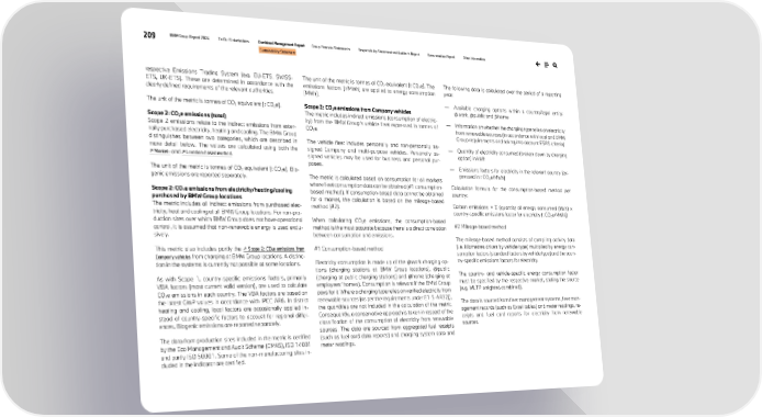 209 BMW Group Report 2024 To Our Stakeholders Combined Management Report Group Financial Statements Responsibility Statement and Auditor’s Report Remuneration Report Other Information Sustainability Statement respective Emissions Trading System (e.g. EU-ETS, SWISS- ETS, UK-ETS). These are determined in accordance with the clearly defined requirements of the relevant authorities. The unit of the metric is tonnes of CO2 equivalent [t CO2e]. Scope 2: CO2e emissions (total) Scope 2 emissions relate to the indirect emissions from exter- nally purchased electricity, heating and cooling. The BMW Group distinguishes between two categories, which are described in more detail below. The values are calculated using both the ↗ Market- and ↗ Location-based method. The unit of the metric is tonnes of CO2 equivalent [t CO2e]. Bio- genic emissions are reported separately. Scope 2: CO2e emissions from electricity/heating/cooling purchased by BMW Group locations The metric includes all indirect emissions from purchased elec- tricity, heat and cooling at all BMW Group locations. For non-pro- duction sites over which BMW Group does not have operational control, it is assumed that non-renewable energy is used exclu- sively. This metric also includes partly the ↗ Scope 2: CO2e emissions from Company vehicles from charging at BMW Group locations. A distinc- tion in the systems is currently not possible at some locations. As with Scope 1, country-specific emissions factors, primarily VDA factors (most current valid version), are used to calculate CO2e emissions in each country. The VDA factors are based on the latest GWP values in accordance with IPCC AR6. In district heating and cooling, local factors are occasionally applied in- stead of country-specific factors to account for regional differ- ences. Biogenic emissions are reported separately. The data from production sites included in the metric is certified by the Eco Management and Audit Scheme (EMAS), ISO 14001 and partly ISO 50001. Some of the non-manufacturing sites in- cluded in the indicator are certified. The unit of the metric is tonnes of CO2 equivalent [t CO2e]. The emissions factors [t/MWh] are applied to energy consumption [MWh]. Scope 2: CO2e emissions from Company vehicles The metric includes indirect emissions (consumption of electric- ity) from the BMW Group’s vehicle fleet expressed in tonnes of CO2e. The vehicle fleet includes personally and non-personally as- signed Company and multi-purpose vehicles. Personally as- signed vehicles may be used for business and personal pur- poses. The metric is calculated based on consumption for all markets where fleet consumption data can be obtained (#1 consumption- based method). If consumption-based data cannot be obtained for a market, the calculation is based on the mileage-based method (#2). When calculating CO2e emissions, the consumption-based method is the most accurate because there is a direct correlation between consumption and emissions. #1 Consumption-based method Electricity consumption is made up of the @work charging op- tions (charging stations at BMW Group locations), @public (charging at public charging stations) and @home (charging at employees’ homes). Consumption is relevant if the BMW Group pays for it. Where a charging type relies on verified electricity from renewable sources (as per the requirements under E1-5-AR32j), the quantities are not included in the calculation of the metric. Consequently, a conservative approach is taken in respect of the classification of the consumption of electricity from renewable sources. The data are sourced from aggregated fuel receipts (such as fuel card data reports) and charging system data and meter readings. The following data is calculated over the period of a reporting year: — Available charging options within a country/legal entity: @work, @public and @home — Information on whether the charging type relies on electricity from renewable sources (in accordance with local and BMW Group requirements and taking into account ESRS criteria) — Quantity of electricity consumed (broken down by charging option) in kWh — Emissions factors for electricity in the relevant country (ex- pressed in t CO2e/MWh) Calculation formula for the consumption-based method per country: Carbon emissions = Σ (quantity of energy consumed (kWh) x country-specific emissions factor for electricity (t CO2e/MWh)) #2 Mileage-based method The mileage-based method consists of compiling activity data (i.e. kilometres driven by vehicle type) multiplied by energy con- sumption factors (standard factors by vehicle type) and the coun- try-specific emissions factors for electricity. The country- and vehicle-specific energy consumption factor must be specified by the respective market, stating the source (e.g. WLTP weighted combined). The data is sourced from fleet management systems, fleet man- agement records (such as Excel tables) and meter readings, re- ceipts and fuel card reports for electricity from renewable sources.