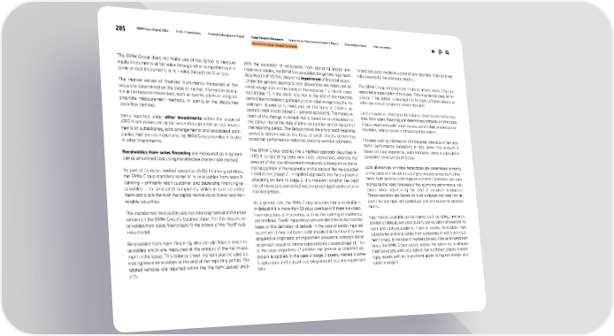 285 BMW Group Report 2024 To Our Stakeholders Combined Management Report Group Financial Statements Responsibility Statement and Auditor’s Report Remuneration Report Other Information Notes to the Group Financial Statements The BMW Group does not make use of the option to measure equity instruments at fair value through other comprehensive in- come or debt instruments at fair value through profit or loss. The market values of financial instruments measured at fair value are determined on the basis of market information availa- ble at the balance sheet date, such as quoted prices or using ap- propriate measurement methods, in particular the discounted cash flow method. Items reported under other investments within the scope of IFRS 9 are measured at fair value through profit or loss. Invest- ments in subsidiaries, joint arrangements and associated com- panies that are not material to the BMW Group are also included in other investments. Receivables from sales financing are measured as a general rule at amortised cost using the effective interest rate method. As part of its asset-backed securities (ABS) financing activities, the BMW Group transfers some of its receivables from sales fi- nancing – primarily retail customer and dealership financing re- ceivables – to structured companies, which in turn securitise them and place them on the capital market as collateralised mar- ketable securities. The transferred receivables are not derecognised and therefore remain on the BMW Group’s balance sheet. For this reason, re- ceivables from sales financing fulfil the criteria of the "hold" busi- ness model. Receivables from sales financing also include finance lease re- ceivables which are measured at the amount of the net invest- ment in the lease. This balance sheet line item also includes op- erating lease receivables at the end of the reporting period. The related vehicles are reported within the line item Leased prod- ucts. With the exception of receivables from operating leases and trade receivables, the BMW Group applies the general approach described in IFRS 9 to determine impairment of financial assets. Under the general approach, loss allowances are measured on initial recognition on the basis of the expected 12-month credit loss (stage 1). If the credit loss risk at the end of the reporting period has increased significantly since initial recognition, the im- pairment allowance is measured on the basis of lifetime ex- pected credit losses (stage 2 – general approach). The measure- ment of the change in default risk is based on a comparison of the default risk at the date of initial recognition and at the end of the reporting period. The default risk at the end of each reporting period is determined on the basis of credit checks, current key economic performance indicators and any overdue payments. The BMW Group applies the simplified approach described in IFRS 9 to operating lease and trade receivables, whereby the amount of the loss allowance is measured subsequent to the in- itial recognition of the receivable on the basis of lifetime expected credit losses (stage 2 – simplified approach). For the purposes of allocating an item to stage 2, it is irrelevant whether the credit risk of the assets concerned has increased significantly since in- itial recognition. As a general rule, the BMW Group assumes that a receivable is in default if it is more than 90 days overdue or if there are objec- tive indications of insolvency, such as the opening of insolvency proceedings. Credit-impaired assets are identified as such on the basis of this definition of default. In the case of credit-impaired assets which had not been credit-impaired at the time they were acquired or originated, an impairment allowance is recognised at an amount equal to lifetime expected credit losses (stage 3). This is the case regardless of whether the general or simplified ap- proach is applied. In the case of stage 3 assets, interest income is calculated on the asset’s carrying amount less any impairment loss. In addition, post-model adjustments are recorded if the risk is not fully covered by the standard models. The BMW Group derecognises financial assets when it has no reasonable expectation of recovery. This may be the case, for in- stance, if the debtor is deemed not to have sufficient assets or other sources of income to service the debt. Loss allowances relating to the balance sheet line item Receiva- bles from sales financing are determined primarily on the basis of past experience with credit losses, current data on overdue re- ceivables, rating classes and scoring information. Forward-looking information (for instance forecasts of key eco- nomic performance indicators) is also taken into account if, based on past experience, such indicators show a substantive correlation to actual credit losses. Loss allowances on trade receivables are determined primarily on the basis of information relating to overdue amounts. Further- more, both positive and negative economic scenarios are used alongside the latest forecasts of key economic performance indi- cators when determining the level of valuation allowances. These scenarios are based on local analyses and take into ac- count, for example, anticipated political and economic develop- ments. Input factors available on the market, such as ratings and prob- abilities of default, are used to calculate valuation allowances for cash and cash equivalents, financial assets, receivables from subsidiaries and receivables from companies in which an invest- ment is held. In the case of marketable securities and investment funds, the BMW Group usually applies the option not to allocate financial assets with a low default risk to different stages. Accord- ingly, assets with an investment grade rating are always allo- cated to stage 1.
