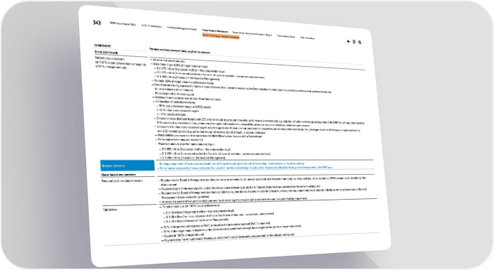 343 BMW Group Report 2024 To Our Stakeholders Combined Management Report Group Financial Statements Responsibility Statement and Auditor’s Report Remuneration Report Other Information Notes to the Group Financial Statements COMPONENT Parameters/measurement base, applicable amounts Bonus (continued) Performance component (at 100% target achievement corresponds to 50% of target amount) — Assessment period one year — Base amount p.a. (50% of target bonus amount): — € 0.475 million (first period of office = first remuneration level) — € 0.575 million (from second period of office or fourth year of mandate = second remuneration level) — € 1.050 million (Chairman of the Board of Management) — Formula: 50% of target amount x performance factor — Non-financial criteria, expressed in terms of a performance factor, aimed at measuring the Board member’s contribution to sustainable and long-term performance and the future orientation of the Company — Relevant period is the vesting year — Additional trend analysis over at least three financial years — Composition of performance factor: — 50% cross-divisional targets with ESG criteria — 40% other cross-divisional targets — 10% individual targets — Criteria for cross-divisional targets with ESG criteria include in particular: Innovation performance (environmental, e.g. reduction of carbon emissions), development of the BMW Group’s reputation based on ESG aspects (e.g. corporate culture, promotion of integrity and compliance), adaptability, attractiveness as an employer, leadership performance — Criteria for the other cross-divisional targets include in particular: Market position compared to competitors, innovation performance (economic), development of the BMW Group’s reputation based on non-ESG-related aspects (e.g. perception on capital markets, brand strength), customer orientation — Measurement parameters and target values are determined before the start of the financial year — Performance factor may not exceed 1.8 — Maximum amount of performance component p.a.: — € 0.855 million (first period of office = first remuneration level) — € 1.035 million (from second period of office or fourth year of mandate = second remuneration level) — € 1.890 million (Chairman of the Board of Management) Strategic relevance — Earnings component of bonus rewards attainment of financial targets and is beneficial for earnings-related aspects of business strategy — Performance component of bonus motivates the pursuit of non-financial strategic targets and is therefore beneficial for the long-term development of the BMW Group Share-based remuneration Personal cash investment amount — Requirement for Board of Management members to invest an earmarked cash amount (personal cash investment amount), net of tax and deductions, in shares of BMW common stock immediately after disbursement — Payment as part of the next payroll run after the Annual General Meeting at which the Financial Statements are presented for the relevant vesting year — Requirement for Board of Management members to hold the acquired shares of common stock for at least four years; this requirement remains in effect for individuals who step down from the Board of Management (share ownership guideline) — Assessment period of five years in total (one year for determining the personal cash investment amount, four years holding requirement) Calculation — Target amount p.a. (at 100% target achievement): — € 1.10 million (first period of office = first remuneration level) — € 1.28 million (from second period of office or fourth year of mandate = second remuneration level) — € 2.35 million (Chairman of the Board of Management) — 50% of target amount depends on RoCE achieved in the Automotive segment (RoCE component) — 50% of the target amount depends on the achievement of predefined strategic focus targets (strategic focus target component) — Capped at 180% of target amount — Payment after the Annual General Meeting at which the Financial Statements are presented for the relevant vesting year