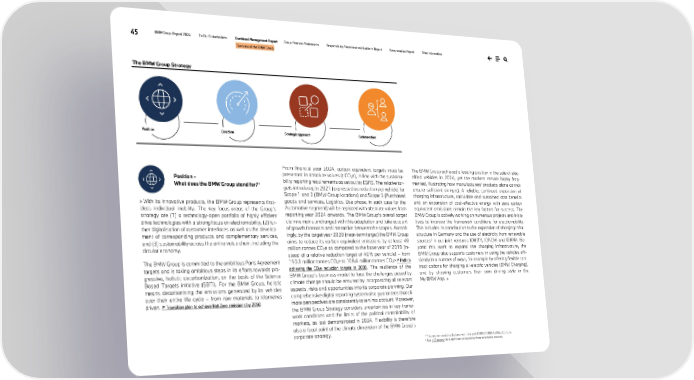 45 BMW Group Report 2024 To Our Stakeholders Combined Management Report Group Financial Statements Responsibility Statement and Auditor’s Report Remuneration Report Other Information Overview of the BMW Group The BMW Group Strategy Position - What does the BMW Group stand for?1 » With its innovative products, the BMW Group represents first- class individual mobility. The key focus areas of the Group’s strategy are (1) a technology-open portfolio of highly efficient drive technologies with a strong focus on electromobility, (2) fur- ther digitalisation of customer interfaces as well as the develop- ment of corresponding products and complementary services, and (3) sustainability across the entire value chain, including the circular economy. The BMW Group is committed to the ambitious Paris Agreement targets and is taking ambitious steps in its efforts towards pro- gressive, holistic decarbonization, on the basis of the Science Based Targets initiative (SBTi). For the BMW Group, holistic means decarbonising the emissions generated by its vehicles over their entire life cycle – from raw materials to kilometres driven. ↗ Transition plan to achieve Net Zero emissions by 2050 From financial year 2024, carbon equivalent targets must be presented in absolute values (t CO2e), in line with the sustaina- bility reporting requirements as set out by ESRS. The relative tar- gets introduced in 2021 (expressed as reduction per vehicle) for Scope 1 and 2 (BMW Group locations) and Scope 3 (Purchased goods and services, Logistics, Use phase, in each case for the Automotive segment) will be replaced with absolute values from reporting year 2024 onwards. The BMW Group’s overall target claim remains unchanged with this adaptation and take account of growth forecasts and interaction between the scopes. Accord- ingly, by the target year 2030 (near-term target) the BMW Group aims to reduce its carbon equivalent emissions by at least 40 million tonnes CO2e as compared to the base year of 2019 (in- stead of a relative reduction target of 40% per vehicle) – from 150.1 million tonnes CO2e to 108.6 million tonnes CO2e ↗ Path to achieving the CO2e reduction targets in 2030. The resilience of the BMW Group’s business model to face the challenges posed by climate change should be ensured by incorporating all relevant aspects, risks and opportunities into its corporate planning. Our comprehensive digital reporting system also guarantees that cli- mate perspectives are consistently taken into account. Moreover, the BMW Group Strategy considers uncertainties in key frame- work conditions and the limits of the political controllability of markets, as last demonstrated in 2024. Flexibility is therefore also a focal point of the climate dimension of the BMW Group’s corporate strategy. The BMW Group achieved a leading position in the sale of elec- trified vehicles in 2024, yet the markets remain highly frag- mented, illustrating how manufacturers’ products alone cannot ensure sufficient demand. A reliable, continued expansion of charging infrastructure, calculable and sustained cost benefits and an expansion of cost-effective energy with zero carbon equivalent emissions remain the key factors for success. The BMW Group is actively working on numerous projects and initia- tives to improve the framework conditions for electromobility. This includes its contribution to the expansion of charging infra- structure in Germany and the use of electricity from renewable sources2 in our joint ventures IONITY, IONCHI and IONNA. Be- yond this work to expand the charging infrastructure, the BMW Group also supports customers in using the vehicles effi- ciently in a number of ways, for example by offering flexible con- tract options for charging all-electric vehicles (BMW Charging), and by showing customers their own driving style in the My BMW App. « 1 This section contains disclosures in line with ESRS 2 SBM-3.48b), c) i., ii., iv. 2 See ↗ Glossary for a definition of electricity from renewable sources. Strategic approach Position Direction Collaboration