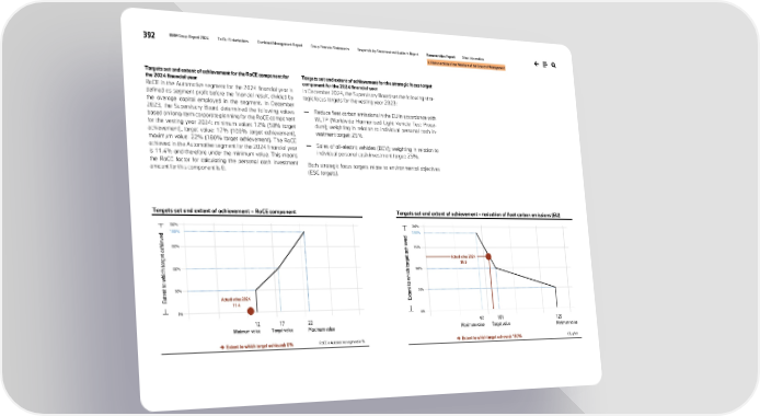 392 BMW Group Report 2024 To Our Stakeholders Combined Management Report Group Financial Statements Responsibility Statement and Auditor’s Report Remuneration Report Other Information II. Remuneration of the Members of the Board of Management Targets set and extent of achievement for the RoCE component for the 2024 financial year RoCE in the Automotive segment for the 2024 financial year is defined as segment profit before the financial result, divided by the average capital employed in the segment. In December 2023, the Supervisory Board determined the following values based on long-term corporate planning for the RoCE component for the vesting year 2024: minimum value: 12% (50% target achievement), target value: 17% (100% target achievement), maximum value: 22% (180% target achievement). The RoCE achieved in the Automotive segment for the 2024 financial year is 11.4% and therefore under the minimum value. This means the RoCE factor for calculating the personal cash investment amount for this component is 0. Targets set and extent of achievement for the strategic focus target component for the 2024 financial year In December 2024, the Supervisory Board set the following stra- tegic focus targets for the vesting year 2023: — Reduce fleet carbon emissions in the EU in accordance with WLTP (Worldwide Harmonised Light Vehicle Test Proce- dure); weighting in relation to individual personal cash in- vestment target: 25%. — Sales of all-electric vehicles (BEV); weighting in relation to individual personal cash investment target: 25%. Both strategic focus targets relate to environmental objectives (ESG targets). Targets set and extent of achievement – RoCE component Targets set and extent of achievement – reduction of fleet carbon emissions (EU) Extent to which target achieved RoCE in Automotive segment in % Extent to which target achieved: 0% 12 Minimum value 17 Target value 22 Maximum value 200% 100% 150% 50% 0% 180% Actual value 2024 11.4 Extent to which target achieved C02 g/km Extent to which target achieved: 130% 97 Maximum value 101 Target value 125 Minimum value 200% 100% 150% 50% 0% 180% Actual value 2024 99.5