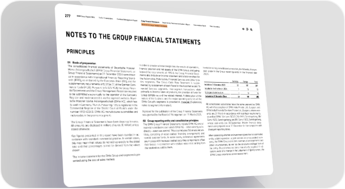 277 BMW Group Report 2024 To Our Stakeholders Combined Management Report Group Financial Statements Responsibility Statement and Auditor’s Report Remuneration Report Other Information Notes to the Group Financial Statements PRINCIPLES 01 Basis of preparation The consolidated financial statements of Bayerische Motoren Werke Aktiengesellschaft (BMW Group Financial Statements or Group Financial Statements) at 31 December 2024 were drawn up in accordance with International Financial Reporting Stand- ards (IFRS), as endorsed by the European Union (EU), and the supplementary requirements of § 315e (1) of the German Com- mercial Code (HGB). Pursuant to § 325 HGB, the Group Finan- cial Statements and the Group Management Report are required to be submitted electronically to the operator of the Company Register and made accessible via that agency’s website. Bayer- ische Motoren Werke Aktiengesellschaft (BMW AG), which has its seat in Germany, Munich, Petuelring 130, is registered in the Commercial Register of the District Court of Munich under the number HRB 42243. BMW AG manufactures automobiles and motorcycles in the premium segment. The Group Financial Statements have been drawn up in euros. All amounts are disclosed in millions of euros (€ million) unless stated otherwise. Key figures presented in this report have been rounded in ac- cordance with standard commercial practise. In certain cases, this may mean that values do not add up exactly to the stated total and that percentages cannot be derived from the values shown. The income statement for the BMW Group and segments is pre- sented using the cost of sales method. In order to provide a better insight into the results of operations, financial position and net assets of the BMW Group, and going beyond the requirements of IFRS 8, the Group Financial State- ments also include an income statement and a balance sheet for the Automotive, Motorcycles, Financial Services and Other Enti- ties segments. The Group Cash Flow Statement is supple- mented by a statement of cash flows for the Automotive and Fi- nancial Services segments. Inter-segment transactions relate primarily to internal sales of products, the provision of funds for Group companies and the related interest. A description of the nature of the business and the major operating activities of the BMW Group’s segments is provided in ↗ note [46] (Explanatory notes to segment information). Approval for the publication of the Group Financial Statements was granted by the Board of Management on 11 March 2025. 02 Group reporting entity and consolidation principles The BMW Group Financial Statements include BMW AG and all material subsidiaries over which BMW AG – either directly or in- directly – exercises control. This also includes 58 structured en- tities, consisting of asset-backed financing arrangements and special purpose funds. In some cases, contractual agreements are in place with the asset-backed securities companies to offset their losses in connection with residual value risks arising from the receivables sold to them. In relation to fully consolidated companies, the following changes took place in the Group reporting entity in the financial year 2024: Germany Foreign Total Included at 31 December 2023 20 187 207 Included for the first time in 2024 1 12 13 No longer included in 2024 – 18 18 Included at 31 December 2024 21 181 202 All consolidated subsidiaries have the same year end as BMW AG with the exception of BMW India Private Ltd., Gurgaon, and BMW India Financial Services Private Ltd., Gurgaon, whose year- ends are 31 March in accordance with local legal requirements, as well as BMW i Ventures SCS SICAV-RAIF, Senningerberg, BiV Carry I SCS, Senningerberg, and BiV Carry II SCS, Senningerberg, whose year-ends are 30 September. Interim financial state- ments are prepared as at 31 December for the companies with divergent reporting dates. When assessing whether an investment gives rise to a controlled entity, a joint operation, a joint venture or an associated com- pany, the BMW Group considers contractual arrangements and other circumstances, as well as the structure and legal form of the entity. Discretionary decisions may also be required. If indi- cations exist of a change in the judgement of (joint) control, the BMW Group undertakes a new assessment. NOTES TO THE GROUP FINANCIAL STATEMENTS