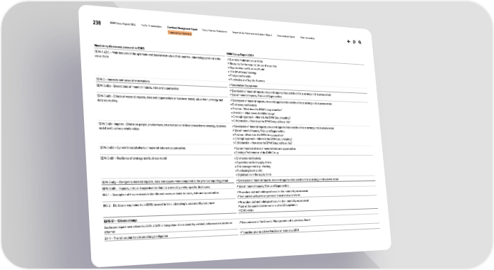 238 BMW Group Report 2024 To Our Stakeholders Combined Management Report Group Financial Statements Responsibility Statement and Auditor’s Report Remuneration Report Other Information Sustainability Statement Mandatory discosures pursuant to ESRS BMW Group Report 2024 SBM-1.42c) – Main features of the upstream and downstream value chain and the undertakings position in the value chain ↗ Business model and value chain ↗ Measures for the responsible use of resources » Organisation and Business Model » The BMW Group Strategy » Production Network » Purchasing and Supplier Network SBM-2 – Interests and views of stakeholders ↗ Stakeholder Engagement SBM-3.48a – Descriptions of material impacts, risks and opportunities ↗ Description of material impacts, risks and opportunities and their link to strategy and business model ↗ List of material Impacts, Risks and Opportunities SBM-3.48b - Effects of material impacts, risks and opportunities on business model, value chain, strategy and decision-making ↗ Description of material impacts, risks and opportunities and their link to strategy and business model » Environmental Analysis » Position – What does the BMW Group stand for? » Direction – What drives the BMW Group? » Strategic approach – Where is the BMW Group heading? » Collaboration – How does the BMW Group achieve this? SBM-3.48c -Impacts - Effects on people, environment, time horizons and their connection to strategy, business model and business relationships ↗ Description of material impacts, risks and opportunities and their link to strategy and business model ↗ List of material Impacts, Risks and Opportunities » Position - What does the BMW Group stand for? » Strategic approach – Where is the BMW Group heading? » Collaboration – How does the BMW Group achieve this? SBM-3.48d – Current financial effects of material risks and opportunities ↗ Current financial effects of material risks and opportunities » Earnings Performance of the BMW Group SBM-3.48f – Resilience of strategy and business model » Environmental Analysis » Expanding resilient supply chains » Risk management in purchasing » Purchasing battery cells » Digitalisation in the supply chain SBM-3.48g – Changes to material impacts, risks and opportunities compared to the previous reporting period ↗ Description of material impacts, risks and opportunities and their link to strategy and business model SBM-3.48h – Impacts, risks and opportunities that are covered by entity-specific disclosures ↗ List of material Impacts, Risks and Opportunities IRO-1 - Description of the processes to identify and assess material impacts, risks and opportunities ↗ Procedure and methodological basis for the materiality assessment ↗ Comparison with previous period and next review of results IRO-2 – Disclosure requirements in ESRS covered by the undertaking’s sustainability statement ↗ Procedure and methodological basis for the materiality assessment ↗ List of Datapoints that derive from other EU Legislation ↗ ESRS-Index ESRS E1 – Climate change Disclosure requirement related to ESRS 2 GOV-3 Integration of sustainability-related performance in incentive schemes ↗ Remuneration of the Board of Management and Supervisory Board E1-1 – Transition plan for climate change mitigation ↗ Transition plan to achieve Net Zero emissions by 2050