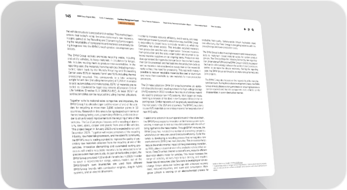 145 BMW Group Report 2024 To Our Stakeholders Combined Management Report Group Financial Statements Responsibility Statement and Auditor’s Report Remuneration Report Other Information Sustainability Statement the vehicle structure is pressed and shredded. This method guar- antees that today’s scrap becomes tomorrow’s raw materials. Insights gained at the Recycling and Dismantling Centre regard- ing the recyclability of components and materials are already be- ing integrated into the BMW Group’s product development pro- cesses. The BMW Group actively promotes recycling waste, including end-of-life vehicles, to keep materials in circulation for longer; this includes reusing them to produce new automobiles. In the reporting year, the materials from the vehicles (including motor- cycles) taken back by the Munich Recycling and Dismantling Center were 85% in material form1 and 95% including thermal processing1 recycled. This corresponds to a total scrapping weight for vehicles (including motorcycles) of 7,263 t1. In relation to sold automobiles and motorcycles, 85%2 of materials are re- cycled as stipulated by legal requirements (European End-of- Life Vehicles Directive ELV 2000 /53 /EC). At least 95%1, 2 of sold automobiles can be recycled (including thermal utilisation). Together with its national sales companies and importers, the BMW Group has already organised the return of end-of-life vehi- cles for recycling at more than 2,800 collection points in 32 countries. Research in this area is being stepped up in terms of the technology being used, processing efficiency, and costs in or- der to drive forward improvements in the recycling of end-of-life vehicles. The Car2Car project focuses on the recycling of alumin- ium, steel, glass, copper and plastic from end-of-life vehicles. This project began in January 2023 and is expected to run until December 2025. Together with representatives of the recycling industry, raw materials processors, and the scientific community, the BMW Group is leading a project to improve the quality of sec- ondary raw materials obtained from the recycling of end-of-life vehicles. Innovative dismantling and automated sorting pro- cesses will enable recyclable materials to be extracted to a far greater extent than previously. As part of the funding project, the BMW Group provided 433 end-of-life vehicles in 2023. In order to cover a representative range, various models out of the BMW Group’s own inventories are used from different BMW Group brands with combustion engines, plug-in hybrid systems, and all-electric drivetrains. In order to increase resource efficiency, avoid waste, and keep materials permanently and efficiently in the loop, the BMW Group is expanding its closed loops to include materials to which the Company has direct access. This includes recycled materials from production and the sales organisation. Selected materials from production and the sales organisation are returned to se- lected material suppliers on an ongoing basis. Production resi- dues generated during production can be on the one hand waste that can be processed and fed back into the production cycle as well as materials not considered as waste that can be reused di- rectly without the need for processing. This approach makes it possible to recover recyclable materials like steel or aluminium and make them available as raw materials for new production processes. The Chinese subsidiary BMW Brilliance Automotive Ltd. estab- lished a collection and recycling network for high-voltage storage (HVS) systems in 2022 to reduce the amount of primary materi- als used to produce new HVS systems. Work began on imple- menting a network of this kind in the European Union in the re- porting year. Similar networks will be gradually established over the next years in the USA and elsewhere. The BMW Group plans to use HVS materials as secondary material for the production of new HVS cells. In addition to actions in its own operations and in the value chain, the BMW Group supports innovation within the ecosystem by in- vesting in start-ups to test out new innovations with the aim of bringing them to the mass market. Through BMW i Ventures, the BMW Group has invested in a number of pioneering companies which focus on resource use and resource efficiency. Cyclic Ma- terials is developing a recycling process that reintegrates rare earth elements (REEs) into manufacturing. This innovation helps reduce the environmental impact of the global energy transition, as REEs play an essential role in the production of electrified ve- hicles. DeepDrive has created a cost-efficient, resource-efficient dual-rotor electric motor for vehicles. This motor increases the range of vehicles, delivers high torque density, and requires fewer natural resources. Lilac Solutions is developing an ion-ex- change lithium extraction technology with enhanced recovery rates, reduced impurities, and lower acid consumption. Man- grove Lithium is working on an electrochemical process for producing high-purity, battery-grade lithium hydroxide more cost-effectively. Our Next Energy is designing batteries with im- proved range and lower production costs. The BMW Group is also investing in research and innovation pro- jects to implement closed material cycles for certain product groups. The Circular Republic initiative, formed by the organisa- tion UnternehmerTUM and the BMW Group in 2023, focuses on the transfer of knowledge between the world of science and com- panies to promote the circular economy. During the reporting year, the BMW Group continued to promote various formats and joint projects. The BMW Group also focuses on the reparability of its manufac- tured products. During the product development phase, the BMW Group already places a strong emphasis on ensuring its products can be repaired and that the components in its vehicles can be disassembled in a non-destructive manner. 1 Additional disclosure, based on SASB ↗ SASB Index.