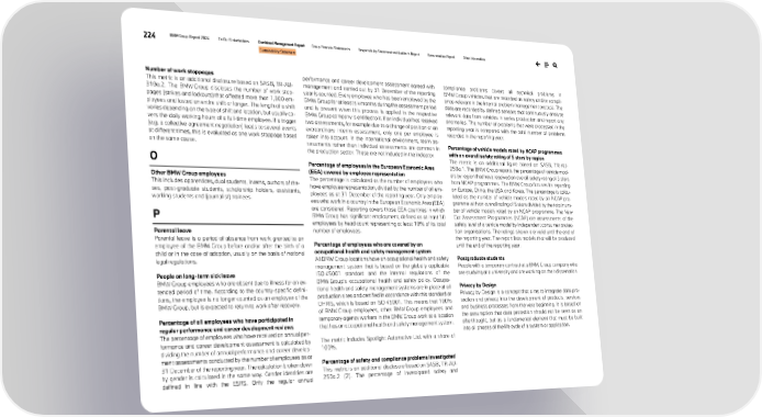 224 BMW Group Report 2024 To Our Stakeholders Combined Management Report Group Financial Statements Responsibility Statement and Auditor’s Report Remuneration Report Other Information Sustainability Statement Number of work stoppages This metric is an additional disclosure based on SASB, TR-AU- 310a.2. The BMW Group discloses the number of work stop- pages (strikes and lockouts) that affected more than 1,000 em- ployees and lasted an entire shift or longer. The length of a shift varies depending on the type of shift and location, but usually co- vers the daily working hours of a full-time employee. If a trigger (e.g. a collective agreement negotiation) leads to several events at different times, this is evaluated as one work stoppage based on the same cause. O Other BMW Group employees This includes apprentices, dual students, interns, authors of the- ses, post-graduate students, scholarship holders, assistants, working students and (journalist) trainees. P Parental leave Parental leave is a period of absence from work granted to an employee of the BMW Group before and/or after the birth of a child or in the case of adoption, usually on the basis of national legal regulations. People on long-term sick leave BMW Group employees who are absent due to illness for an ex- tended period of time. According to the country-specific defini- tions, the employee is no longer counted as an employee of the BMW Group, but is expected to return to work after recovery. Percentage of all employees who have participated in regular performance and career development reviews The percentage of employees who have received an annual per- formance and career development assessment is calculated by dividing the number of annual performance and career develop- ment assessments conducted by the number of employees as at 31 December of the reporting year. The calculation broken down by gender is calculated in the same way. Gender identities are defined in line with the ESRS. Only the regular annual performance and career development assessment agreed with management and carried out by 31 December of the reporting year is counted. Every employee who has been employed by the BMW Group for at least six months during the assessment period and is present when this process is applied in the respective BMW Group company is entitled to it. If an individual has received two assessments, for example due to a change of position or an extraordinary interim assessment, only one per employee is taken into account. In the international environment, team as- sessments rather than individual assessments are common in the production sector. These are not included in the indicator. Percentage of employees in the European Economic Area (EEA) covered by employee representation The percentage is calculated as the number of employees who have employee representation, divided by the number of all em- ployees as at 31 December of the reporting year. Only employ- ees who work in a country in the European Economic Area (EEA) are considered. Reporting covers those EEA countries in which BMW Group has significant employment, defined as at least 50 employees by head count representing at least 10% of its total number of employees. Percentage of employees who are covered by an occupational health and safety management system All BMW Group locations have an occupational health and safety management system that is based on the globally applicable ISO 45001 standard and the internal regulations of the BMW Group’s occupational health and safety policy. Occupa- tional health and safety management systems are in place at all production sites and certified in accordance with this standard or OHRIS, which is based on ISO 45001. This means that 100% of BMW Group employees, other BMW Group employees and temporary agency workers in the BMW Group work at a location that has an occupational health and safety management system. The metric includes Spotlight Automotive Ltd. with a share of 100%. Percentage of safety and compliance problems investigated This metric is an additional disclosure based on SASB, TR-AU- 250a.2 (2). The percentage of investigated safety and compliance problems covers all technical problems in BMW Group vehicles that are recorded as safety and/or compli- ance-relevant in the internal problem management process. The data are recorded by defined sensors that continuously analyse relevant data from vehicles in series production and report any anomalies. The number of problems that were processed in the reporting year is compared with the total number of problems recorded in the reporting year. Percentage of vehicle models rated by NCAP programmes with an overall safety rating of 5 stars by region The metric is an additional figure based on SASB, TR-AU- 250a.1. The BMW Group reports the percentage of vehicle mod- els by region that have received an overall safety rating of 5 stars from NCAP programmes. The BMW Group focuses its reporting on Europe, China, the USA and Korea. The percentage is calcu- lated as the number of vehicle models rated by an NCAP pro- gramme with an overall rating of 5 stars divided by the total num- ber of vehicle models rated by an NCAP programme. The New Car Assessment Programmes (NCAP) are assessments of the safety level of a vehicle model by independent consumer protec- tion organisations. The ratings shown are valid until the end of the reporting year. The report lists models that will be produced until the end of the reporting year. Postgraduate students People with a temporary contract at a BMW Group company who are studying at a university and are working on their dissertation. Privacy by Design Privacy by Design is a concept that aims to integrate data pro- tection and privacy into the development of products, services and business processes from the very beginning. It is based on the assumption that data protection should not be seen as an afterthought, but as a fundamental element that must be built in