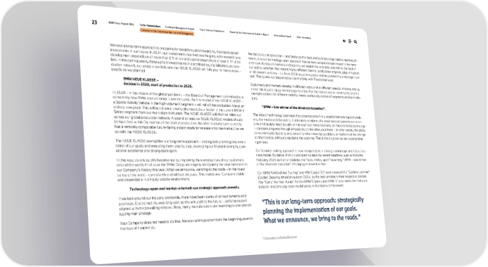 23 BMW Group Report 2024 To Our Stakeholders Combined Management Report Group Financial Statements Responsibility Statement and Auditor’s Report Remuneration Report Other Information Statement of the Chairman of the Board of Management We take a long-term approach to preparing for breakthrough innovations, making targeted investments in our future. In 2024, our investments reached new heights, with research and development expenditure of more than € 9 billion and capital expenditure of over € 11.8 bil- lion. In the coming years, these upfront investments in electrification, digitalisation, our pro- duction network, our product portfolio and the NEUE KLASSE will fully pay for themselves – exactly as we planned. BMW NEUE KLASSE – decided in 2020, start of production in 2025. In 2020 – in the middle of the global pandemic – the Board of Management committed to a completely new BMW product range. Later this year, the first model of the NEUE KLASSE – a Sports Activity Vehicle in the high-volume X segment – will roll off the production line at an entirely new plant. This will be followed shortly afterwards by a Sedan in the current BMW 3 Series segment from our main plant in Munich. The NEUE KLASSE will then be rolled out across our global production network. A total of at least six NEUE KLASSE models should be launched within 24 months of the start of production. No other manufacturer currently has a remotely comparable future-facing project ready for release onto the market, like we do with the NEUE KLASSE. The NEUE KLASSE exemplifies our long-term approach – strategically planning implemen- tation of our goals and executing them step by step, leveraging our financial strength, oper- ational excellence and strong team spirit. In this way, visions quickly become reality, improving the everyday lives of our customers around the world. All of us at the BMW Group are eagerly anticipating the next milestone in our Company’s history this year. What we announce, we bring to the roads – in the truest sense of the word – consistently and without excuses. This makes your Company stable and dependable in a highly volatile environment. Technology-open and market-oriented: our strategic approach prevails. If we look around our industry worldwide, there have been plenty of announcements and promises. Electromobility was long seen as the only path to the future – partly because it aligned with the prevailing mindset. Now, many manufacturers are reversing course and ad- justing their strategy. Your Company does not need to do that. We took a firm position from the beginning, even in the face of headwinds. We did so out of conviction – and because the facts and business logic said something dif- ferent. It is our technology-open approach that delivers a rapid climate impact in the here and now. Across all markets and regions, we exploit the available potential to the best of our ability: whether that means highly efficient internal combustion engines, plug-in hybrids or all-electric vehicles – or, from 2028 on, a production vehicle powered by a hydrogen fuel cell. This is why we deepened our partnership with Toyota last year. Customers and markets develop in different ways and at different speeds. Anyone who ig- nores this is passing up market opportunities. For this reason, we will continue to provide the right options for different mobility needs worldwide, across all segments and technolo- gies. “BMW – late winner of the drivetrain transition”. The idea of technology openness has since become firmly established among policymak- ers, the media and the public. It ultimately combines the exact two components our econ- omy and society need equally on the road to climate neutrality: on the one hand, technology – constant progress through innovation; on the other, openness – in other words, the ability to respond with flexibility and versatility when external conditions or market realities change at short notice, without prejudging the outcome. This is the situation we are experiencing right now. Our forward-looking approach is now recognised as a strategic advantage and robust busi- ness model. Evidence of this is provided not least by recent headlines, such as from the February 2025 edition of trade journal “auto, motor, sport” asserting: “BMW – late winner of the drivetrain transition”. I’m happy to leave it at that. Our BMW 540d xDrive Touring* and MINI Cooper SE* were awarded the “Goldene Lenkrad” (Golden Steering Wheel) in autumn 2024, as the best vehicles in their respective classes. The “Car of the Year Award” for the BMW 5 Series and BMW i5* also marks the first acco- lades for a technology-open model series in the history of the award. * ↗ Consumption and Carbon Disclosures. ‘‘This is our long-term approach: strategically planning the implementation of our goals. What we announce, we bring to the roads.’’