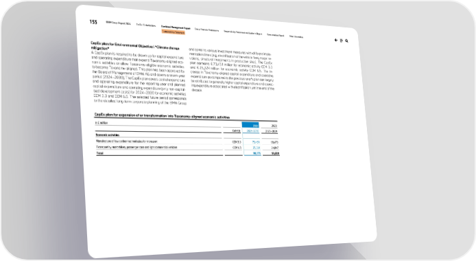155 BMW Group Report 2024 To Our Stakeholders Combined Management Report Group Financial Statements Responsibility Statement and Auditor’s Report Remuneration Report Other Information Sustainability Statement CapEx plan for Environmental Objective I “Climate change mitigation” A CapEx plan is required to be drawn up for capital expenditure and operating expenditure that expand Taxonomy-aligned eco- nomic activities or allow Taxonomy-eligible economic activities to become Taxonomy-aligned. This plan has been approved by the Board of Management of BMW AG and covers a seven-year period (2024–2030). The CapEx plan covers capital expenditure and operating expenditure for the reporting year and planned capital expenditure and operating expenditure (only non-capital- ised development costs) for 2024–2030 for economic activities CCM 3.3 and CCM 6.5. The selected future period corresponds to the detailed long-term corporate planning of the BMW Group and contains various investment measures with different imple- mentation times (e.g. electrification of the vehicle fleet, model re- visions, structural investments in production sites). The CapEx plan earmarks € 73,451 million for economic activity CCM 3.3 and € 25,324 million for economic activity CCM 6.5. The in- crease in Taxonomy-aligned capital expenditure and operating expenditure as compared to the previous year’s plan can largely be attributed to generally higher capital expenditure and operat- ing expenditure associated with electrification until the end of the decade. CapEx plan for expansion of or transformation into Taxonomy-aligned economic activities in € million 2024 2023 Code(s) 2024–2030 2023–2029 Economic activities Manufacture of low carbon technologies for transport CCM 3.3 73,451 68,473 Transport by motorbikes, passenger cars and light commercial vehicles CCM 6.5 25,324 24,847 Total 98,775 93,320