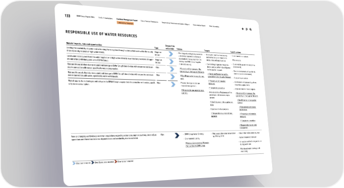 133 BMW Group Report 2024 To Our Stakeholders Combined Management Report Group Financial Statements Responsibility Statement and Auditor’s Report Remuneration Report Other Information Sustainability Statement RESPONSIBLE USE OF WATER RESOURCES Material impacts, risks and opportunities Type Stage of the value chain Policies Targets Specific actions Limiting the availability of water and/or harming the ecosystem through water withdrawals within the supply chain especially in areas of high-water stress. Negative Impact − Multistage due diligence process to uphold environmental and social standards in the supply chain (in- cluding the BMW Group Supplier Code of Conduct) ↗ Social and Environmental Re- sponsibility in the Supplier Network ↗ Due Diligence in the supplier net- work − Process for responsible raw material management ↗ Responsible raw material man- agement − No targets that focus exclusively and thematically on material im- pacts, risks and opportunities − Overarching targets for the proce- dures used to perform due diligence in the supplier network ↗ Social and Environmental Re- sponsibility in the Supplier Network ↗ Preventive and remedial measures ↗ Complaints procedure − Analysis of the effectiveness of the processes and measures imple- mented ↗ Due Diligence in the supplier net- work − Objectives for local projects ↗ Responsible raw material man- agement − Commitment to initiatives − Risk analysis − Sustainability questionnaire (online assessment) − On-site assessments of supplier lo- cations (on-site assessment) − Complaints procedure − Certification and traceability of raw materials supply chains − Implementation of local projects ↗ Social and Environmental Re- sponsibility in the Supplier Network ↗ Due Diligence in the supplier network ↗ Risk analysis and control mechanisms ↗ Preventive and remedial measures ↗ Complaints procedure ↗ Responsible raw material management Local water scarcity and threat to water supply due to high water intensity in production processes of suppli- ers and other preliminary products of BMW Group. Negative Impact Risk and financial effect due to reputational damage to BMW Group's brand value with respect to controver- sies in connection with water, specifically water consumption. Risk Risk and financial effect due to reputational damage to BMW Group's brand value with respect to controver- sies in connection with water, specifically water withdrawals. Risk Risk of supply chain shortages and delays in the BMW Group's supply chain in connection with water, specifi- cally water consumption. Risk New or changing worldwide government regulations regarding water consumption could require to adjust operations and therefore increase dependencies and availability due to exclusion. Risk − BMW Group Water Strategy − Environmental policy ↗ Holistic Environmental Manage- ment within the BMW Group − Reduce potable water consumption by 25% by 2030 − Use of alternative water sources − Water treatment and reuse − Innovation and technologies for re- ducing water use − Risk-based water strategy and monitoring Upstream material Own Operations material Downstream material