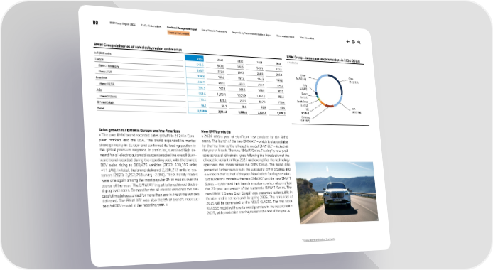 80 BMW Group Report 2024 To Our Stakeholders Combined Management Report Group Financial Statements Responsibility Statement and Auditor’s Report Remuneration Report Other Information Financial Performance BMW Group deliveries of vehicles by region and market in 1,000 units 2024 2023 2022 2021 2020 Europe 948.5 943.0 878.5 949.1 913.6 thereof Germany 265.7 272.6 254.3 266.8 285.0 thereof UK 168.8 159.2 157.3 164.3 163.2 Americas 482.7 482.0 441.5 451.7 379.7 thereof USA 399.3 397.3 363.5 368.0 307.9 Asia 963.6 1,073.1 1,031.0 1,067.9 986.5 thereof China 715.2 826.3 793.5 847.9 778.4 Other markets 56.1 56.1 48.6 52.8 45.4 Total 2,450.9 2,554.2 2,399.6 2,521.5 2,325.2 BMW Group – largest automobile markets in 2024 (2023) in % of sales Sales growth for BMW in Europe and the Americas » The core BMW brand recorded sales growth in 2024 in Euro- pean markets and the USA. The brand expanded its market share primarily in Europe and confirmed its leading position in the global premium segment. In particular, sustained high de- mand for all-electric automobiles counteracted the overall down- ward trend recorded during the reporting year, with the brand’s BEV sales rising to 368,475 vehicles (2023: 330,197 units; +11.6%). In total, the brand delivered 2,200,217 units to cus- tomers (2023: 2,252,793 units; –2.3%). The X Family models were one again among the most popular BMW models over the course of the year. The BMW X1* in particular achieved double- digit growth rates. Demand for the all-electric version of this suc- cessful model accounted for more than one in five of the vehicles delivered. The BMW iX1* was also the BMW brand’s most suc- cessful BEV model in the reporting year. « New BMW products » 2024 was a year of significant new products for the BMW brand. The launch of the new BMW X2* – which is also available for the first time as the all-electric model BMW iX2* – kicked off the year in March. The new BMW 5 Series Touring* is now avail- able across all drivetrain types following the introduction of the all-electric variant in May 2024 and exemplifies the technology openness that characterises the BMW Group. The brand also presented further revisions to the successful BMW 3 Series and 4 Series in the first half of the year. Now in their fourth generation, two successful models – the new BMW X3* and the new BMW 1 Series – celebrated their launch in autumn, which also marked the 20-year anniversary of the successful BMW 1 Series. The new BMW 2 Series Gran Coupé* was presented to the public in October and is set to launch in spring 2025. The remainder of 2025 will be dominated by the NEUE KLASSE. The first NEUE KLASSE model will have its world premiere in the second half of 2025, with production starting towards the end of the year. « * ↗ Consumption and Carbon Disclosures. China 29.2 (32.3) USA 16.3 (15.6) Germany 10.8 (10.7) UK 6.9 (6.2) South Korea 3.5 (3.3) France 3.4 (3.4) Italy 3.3 (3.1) Other 26.6 (25.4) *
