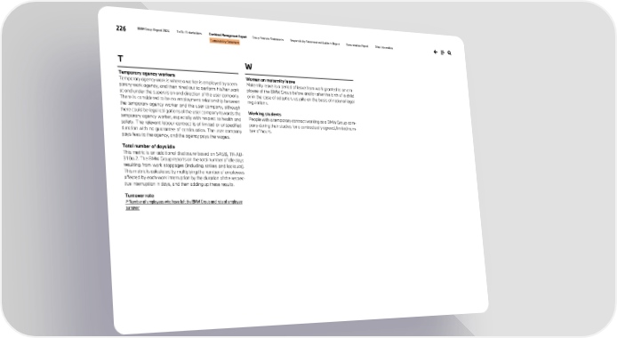 226 BMW Group Report 2024 To Our Stakeholders Combined Management Report Group Financial Statements Responsibility Statement and Auditor’s Report Remuneration Report Other Information Sustainability Statement T Temporary agency workers Temporary agency work is where a worker is employed by a tem- porary work agency, and then hired out to perform his/her work at and under the supervision and direction of the user company. There is considered to be no employment relationship between the temporary agency worker and the user company, although there could be legal obligations of the user company towards the temporary agency worker, especially with respect to health and safety. The relevant labour contract is of limited or unspecified duration with no guarantee of continuation. The user company pays fees to the agency, and the agency pays the wages. Total number of days idle This metric is an additional disclosure based on SASB, TR-AU- 310a.2. The BMW Group reports on the total number of idle days resulting from work stoppages (including strikes and lockouts). This metric is calculated by multiplying the number of employees affected by each work interruption by the duration of the respec- tive interruption in days, and then adding up these results. Turnover rate ↗ Number of employees who have left the BMW Group and rate of employee turnover W Women on maternity leave Maternity leave is a period of leave from work granted to an em- ployee of the BMW Group before and/or after the birth of a child or in the case of adoption, usually on the basis of national legal regulations. Working students People with a temporary contract working at a BMW Group com- pany during their studies for a contractually agreed, limited num- ber of hours.
